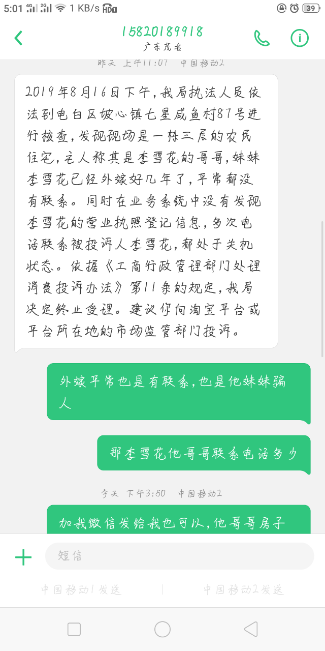 淘宝披露的商家李某的真实信息,拨打茂名消费者投诉电话:066812315;工作人员核实后前往李某的住处,以下是他哥哥的说辞以及家里住处。工作人员向他询问李某的电话,他哥哥也不给,纵容妹妹做个骗子,以不常联系做说辞,难道外嫁就跟家里边什么人出什么事沾不上边是吗。希望他这位哥哥能奉劝李某赔偿金额,息事宁人,不然广东茂名就出这么一位电信诈骗,希望有认识这家的茂名朋友能帮忙联系这家人出来解决