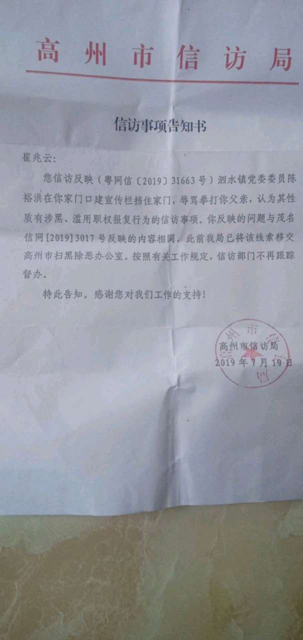 事情的缘由是2019年6月24号微信上有个叫做高州信息共享平台的公众号发表了一篇《关于微信不实视频反映泗水镇凤塘村委会塘普村建设文化广场安装宣传栏的澄清说明》,这篇文章提到崔作豪家所谓的侵占集体用地和阻碍新农村建设等问题做一一回应。