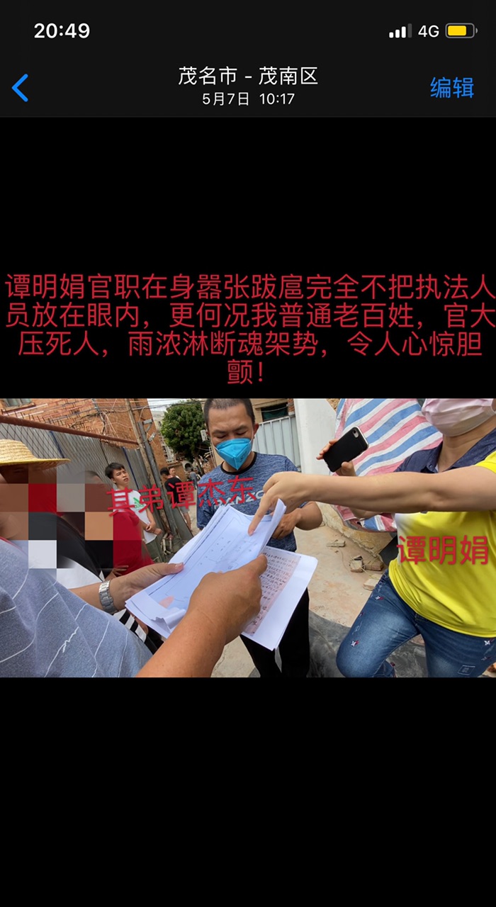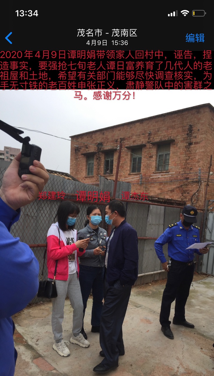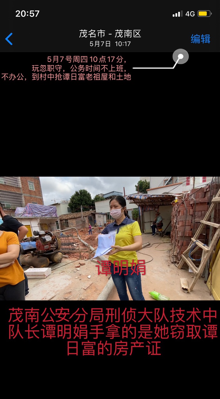谭*娟以茂南公安分局刑侦大队技术中队长的职权和社会上人际关系作为保护伞。谭*娟、父亲谭*寿、其弟谭*东、其弟媳妇郑*玲,横行乡里、欺凌百姓、官大压死人,雨浓淋断魂,有预谋,有计划,开展了一幕幕颠倒黑白,捏造事实去诬告,巧取豪夺谭日富的养育了几代人的老祖屋和土地。村大队,村委会,城管执法等部门和谭日富一家人都要受这个“官”字,打压和屈服。恳请政府部门能够尽快调查处理,肃静警队里的害群之马,还给社会的稳定,还给执法部门公平公正的执法和老百姓合法权益,安居乐业。