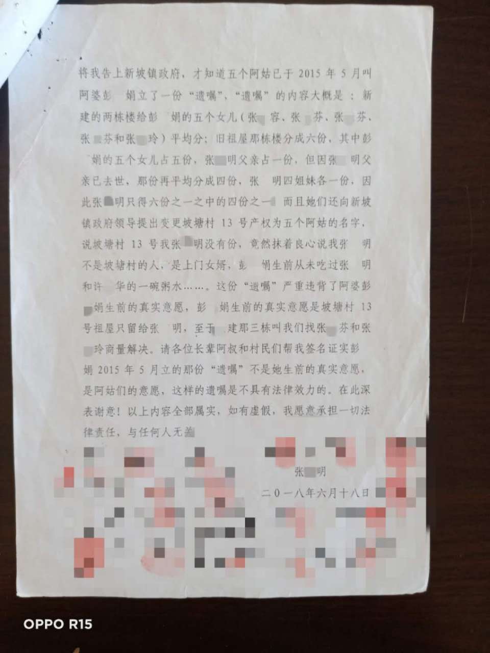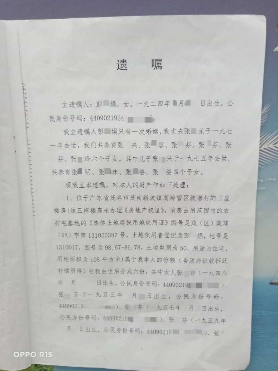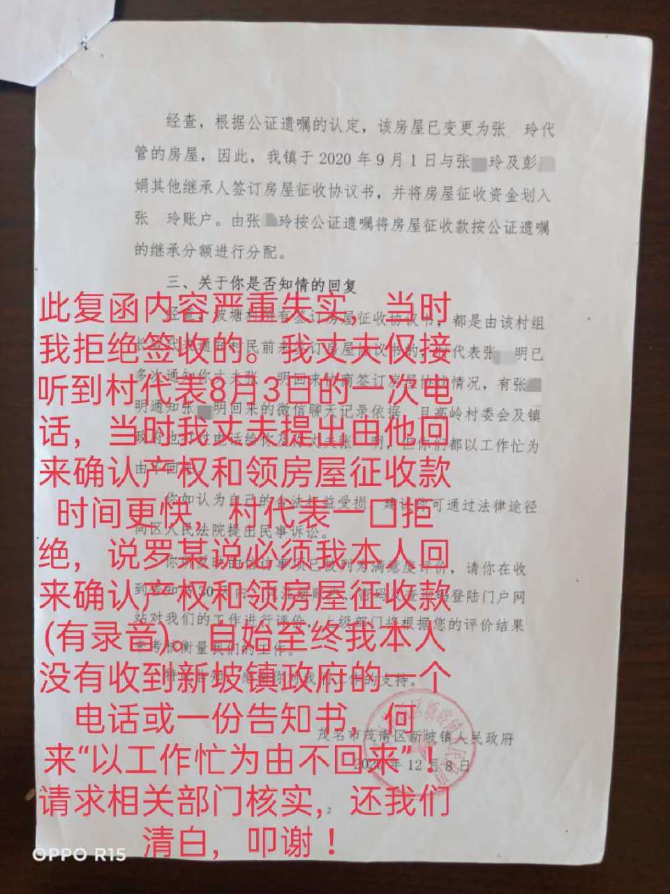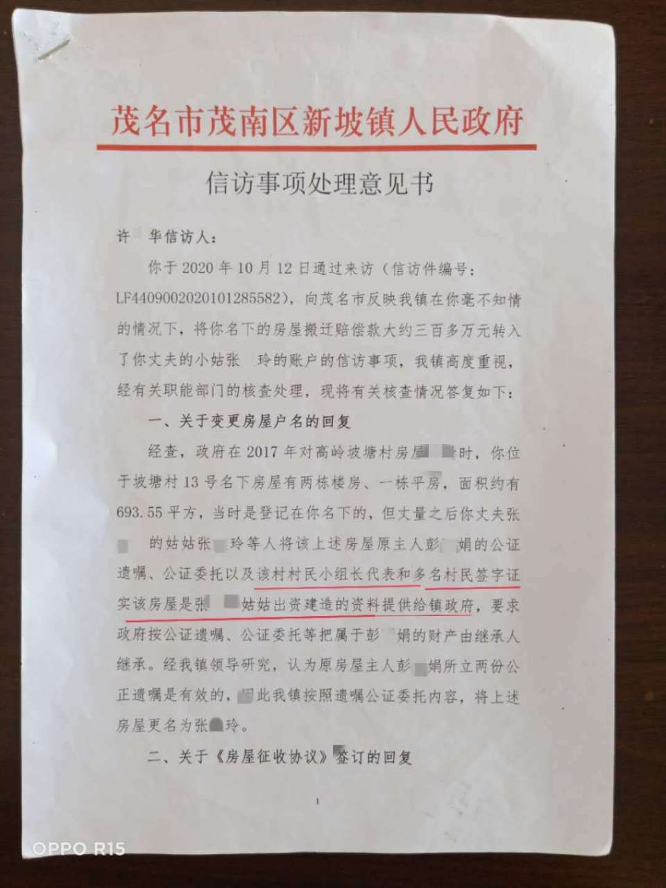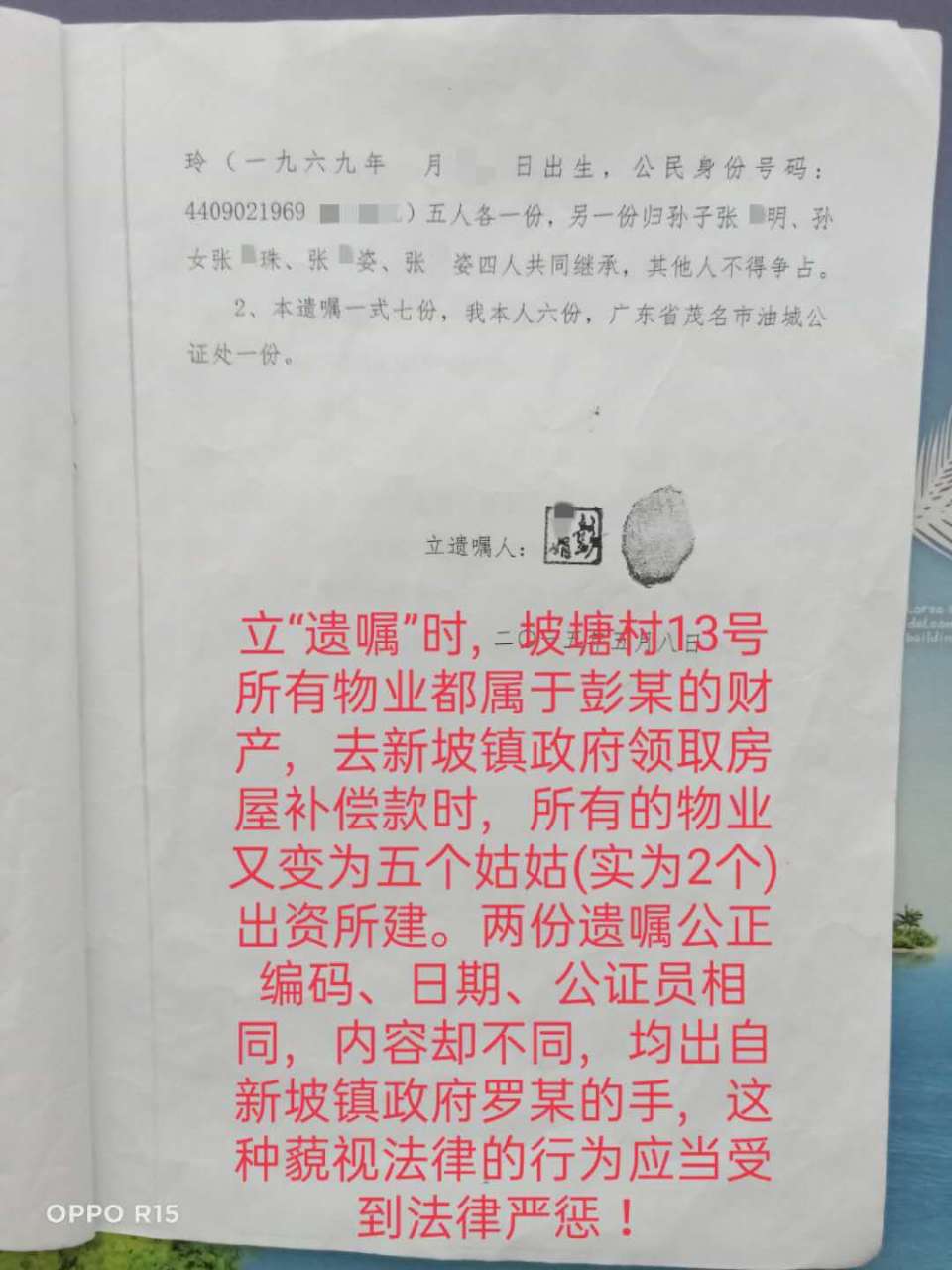 我是茂名市茂南区新坡镇高岭乡坡塘村13号原籍居民而且是唯一产权人、唯一被征收人,是享受拆迁赔偿款的正当权益人。而且经过向省信访局工作人员、公证处、律师等相关专业人士咨询,此“遗嘱”应经继承权公证后,再由法院重新分配。因此罗*书记无权将丈量在我名下的693.55平方米的征收补偿款转入张*玲帐户及更名!我将此事转达给相关部门和罗*书记及曾*青书记,仍遭拒绝受理和纠正!