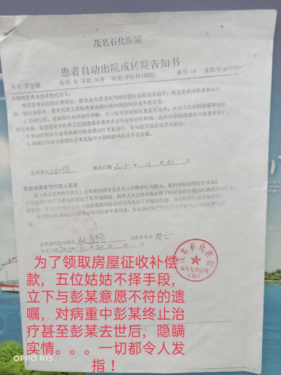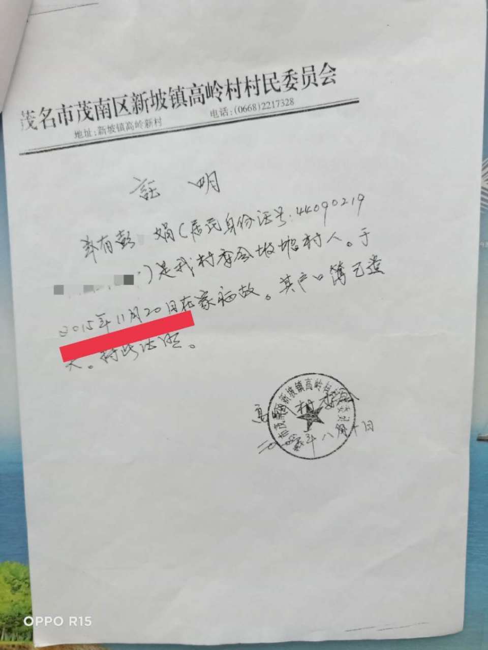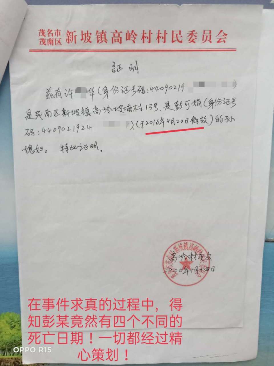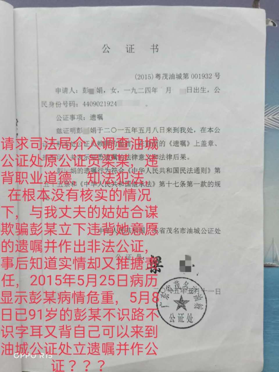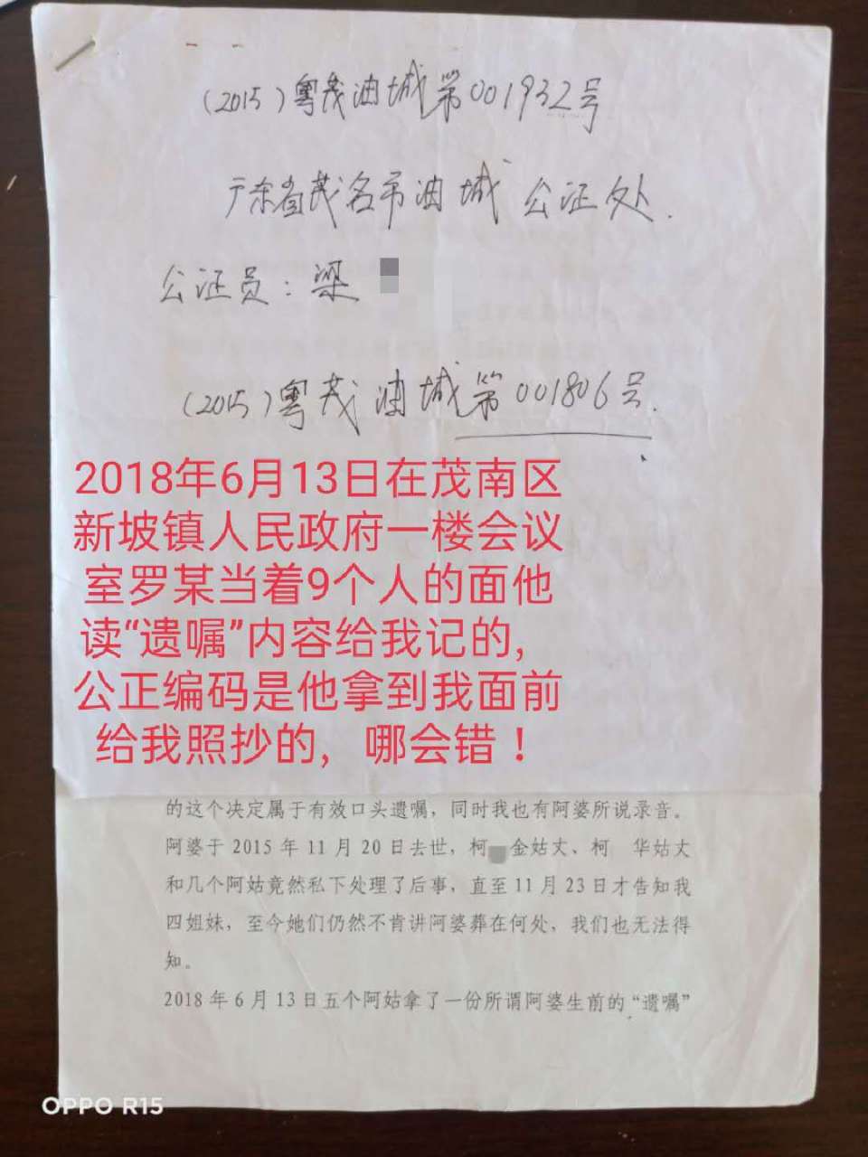 本人是茂名市茂南区新坡镇高岭村委会坡塘村13号村民许福华,电话号码:13925359168 身份证号码:44090219731104***X,按搬迁政策,本可享受693.55平方米约300多万拆迁补偿款。但广东省茂名市油城公证处原公证员梁*严重失职,未经核实,仅凭茂南区新坡镇高岭乡大队原书记邹*才一份失实的证明便作出公证遗嘱。且遗嘱在尚未办理继承权公正的前提下,被丈夫的五位姑姑密谋篡改(前后两份遗嘱时间、公正编码一样,公证员相同,但内容不同)伙同新坡镇政府罗*书记及搬迁办蔡**,擅自将所有搬迁款转账到丈夫小姑张*玲名下。造成了我重大的经济损失。
