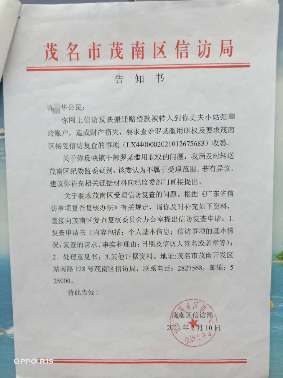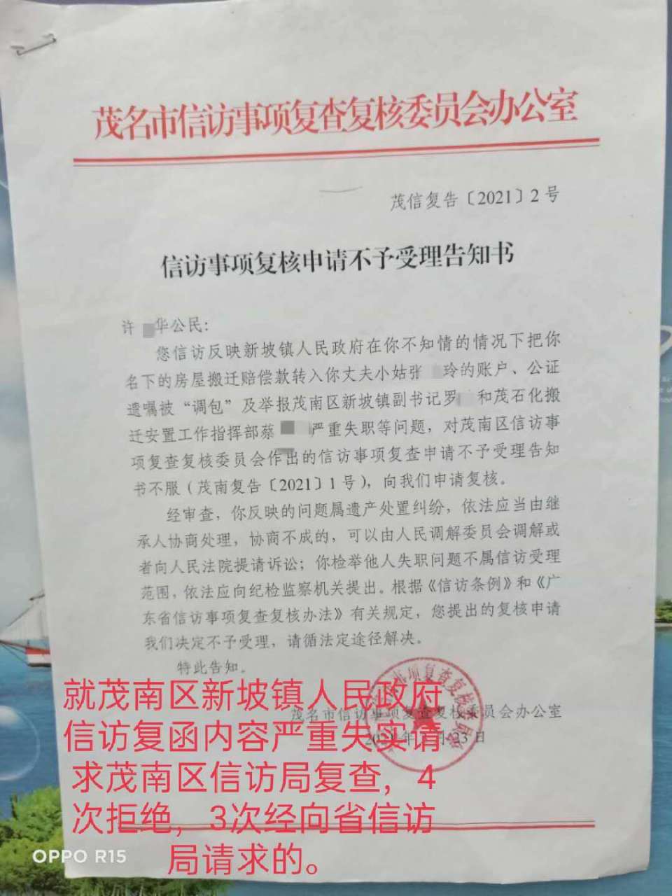 本人分别向茂名市和茂南区纪委监委、茂南区信访局(我向广东省信访局反映了3次,茂南区信访局4次均遭拒复查)、茂名市信访局、茂石化信访局、茂石化纪委监委呈递举报材料,均不受理!