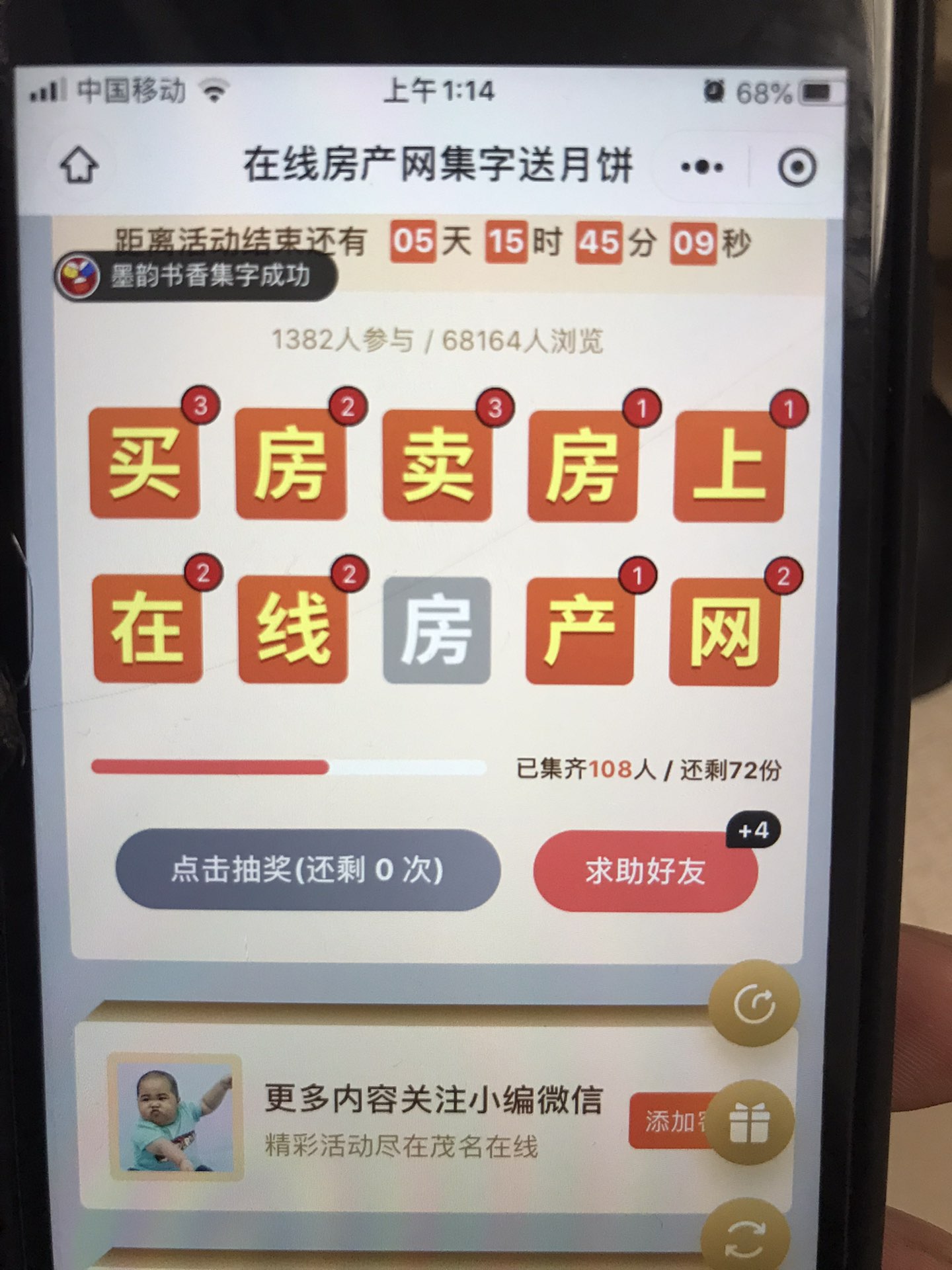 天天在集字,看能否集齐有月饼拿,昨晚,就在昨晚,我发现了一个套路,一个很大的套路。看图,还欠一个房字,昨晚突然抽中一个房字了。以为可以成功,但是却是买“房”的房,它和“