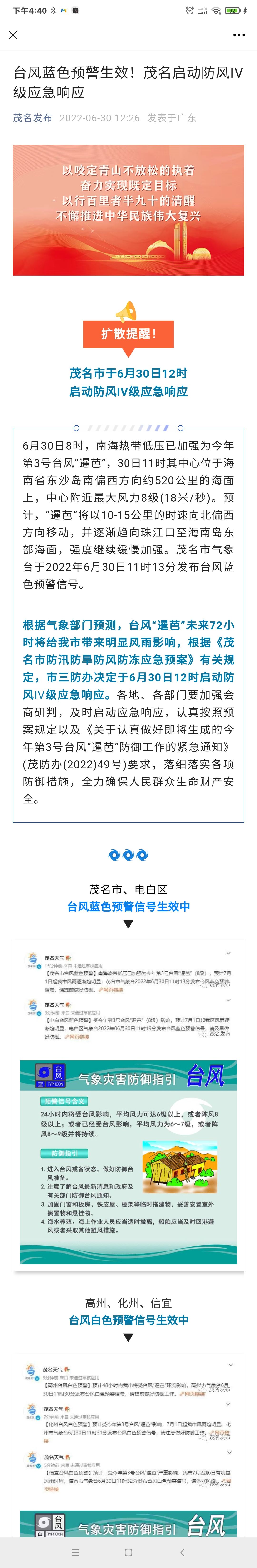 鉴于台风“暹芭”已进入南海且中心风力达到8级,气象部门预测,未来72小时内有可能将给我市带来明显风雨影响,根据《茂名市防汛防旱防风防冻应急预案》有关规定,市三防办决定于6月30日12时启动防风IV级应急响应。