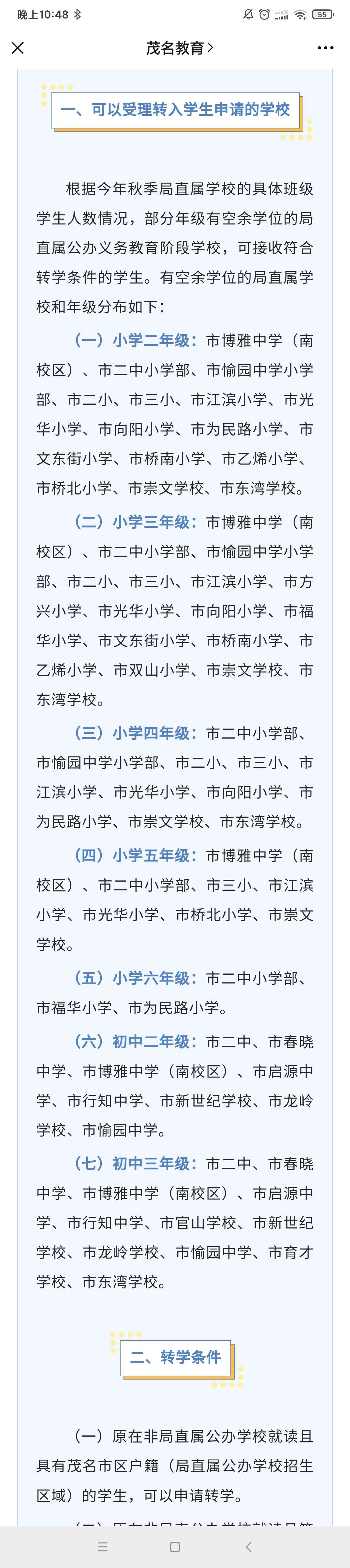(一)原在非局直属公办学校就读且具有茂名市区户籍(局直属公办学校招生区域)的学生,可以申请转学。