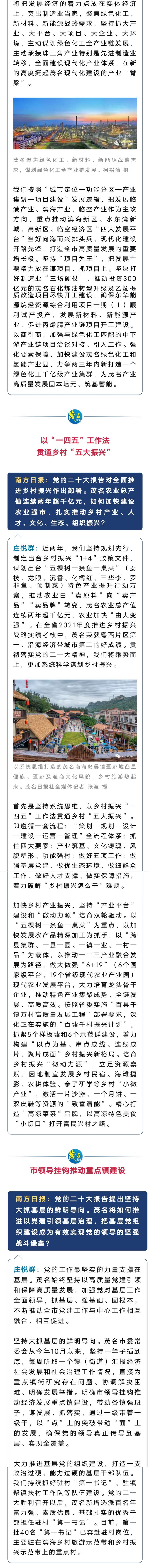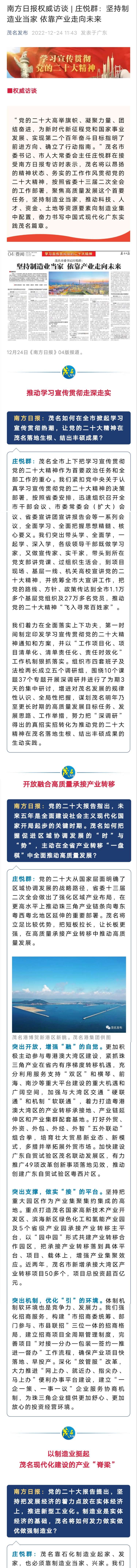 庄悦群:茂名靠石化制造业起家、发家,也必须靠制造业当家、兴家。我们将把发展经济的着力点放在实体经济上,突出制造业当家,聚焦绿色化工、新材料、新能源战略需求,坚持抓大产业、大平台、大项目、大企业、大环境,主动谋划绿色化工全产业链发展,主动承接珠三角产业特别是先进制造业转移,全面建设现代化产业体系,在新的高度挺起茂名现代化建设的产业“脊梁”。