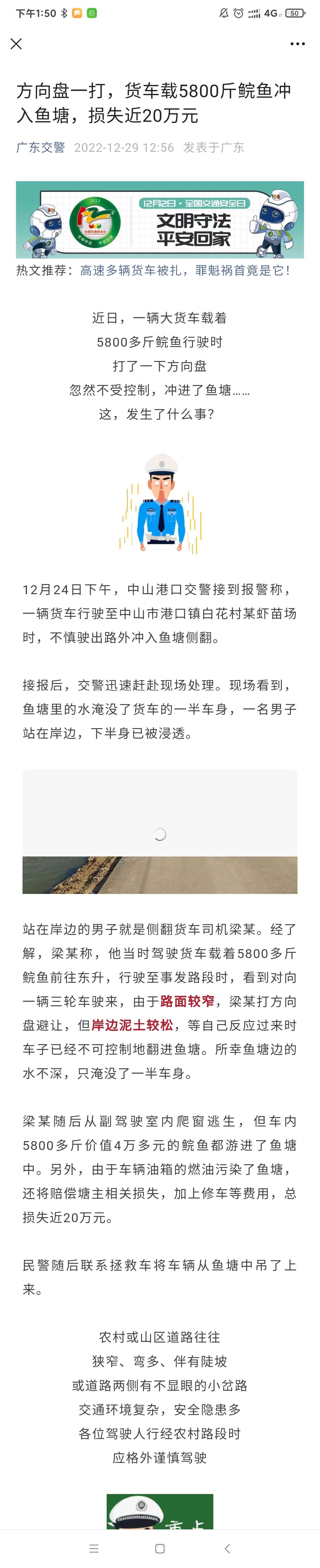 方向盘一打,货车载5800斤鲩鱼冲入鱼塘,损失近20万元
