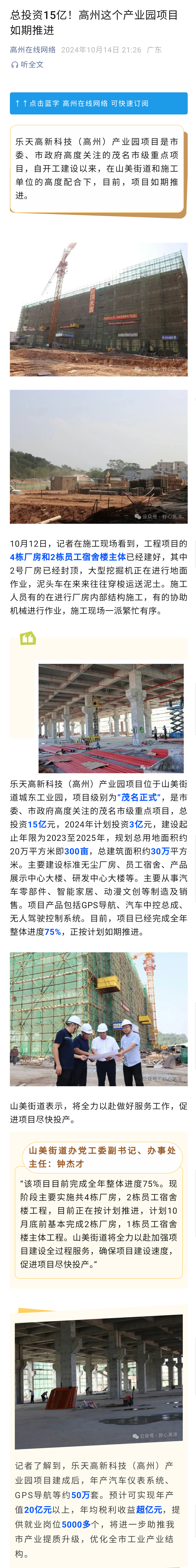 小峰哥 发表于 2024-10-15 16:56 高州乐天科技产业园位于城东工业园,总投资15亿元,其中2024年计划投资3亿元。项目总用地面积约300亩,总建 ...