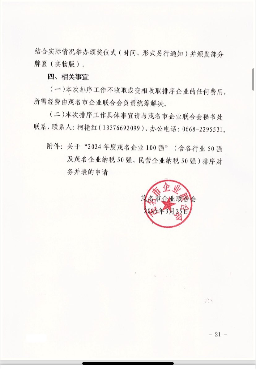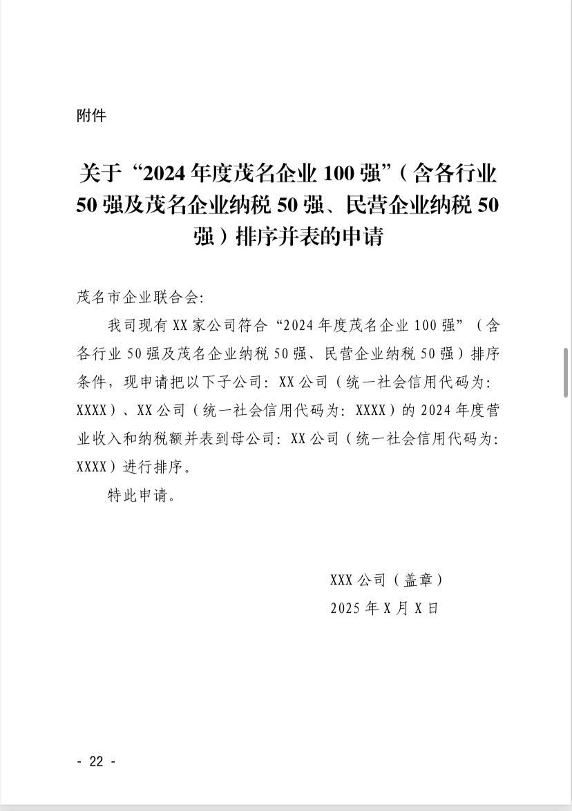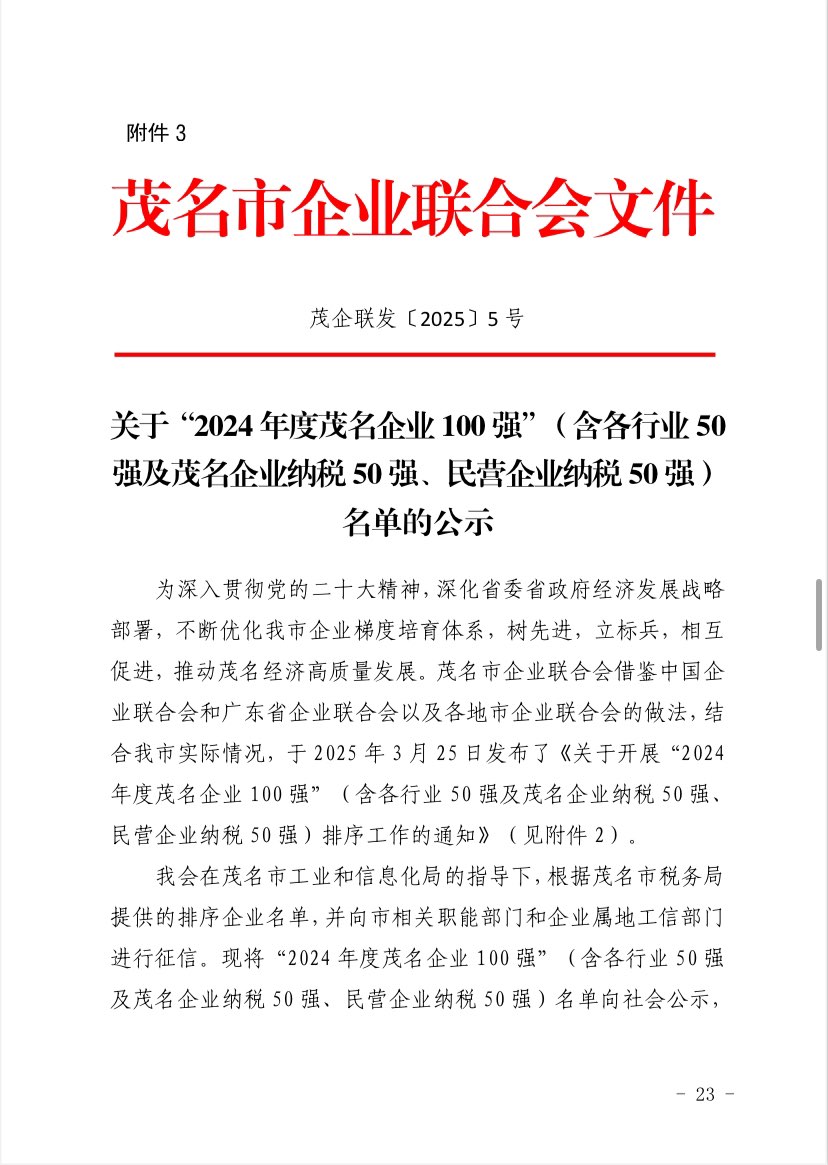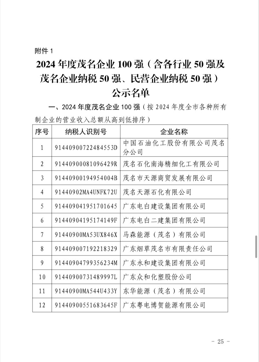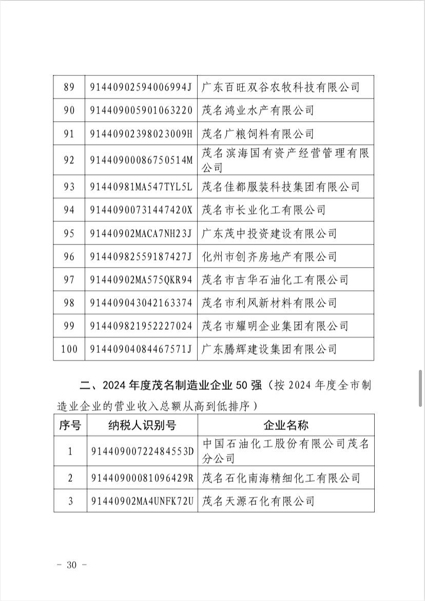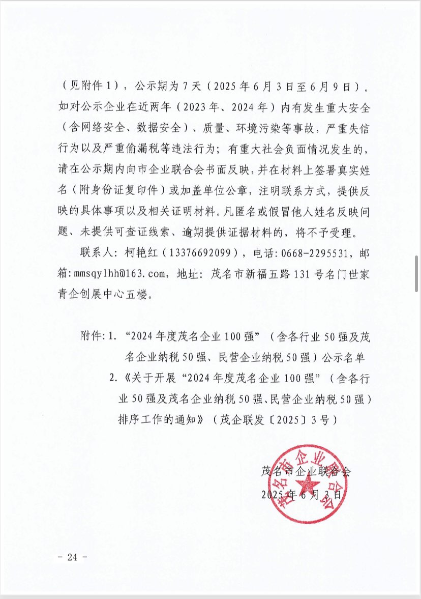 关于 2024 年度茂名企业100强、企业 50强名单的第二次公 ...