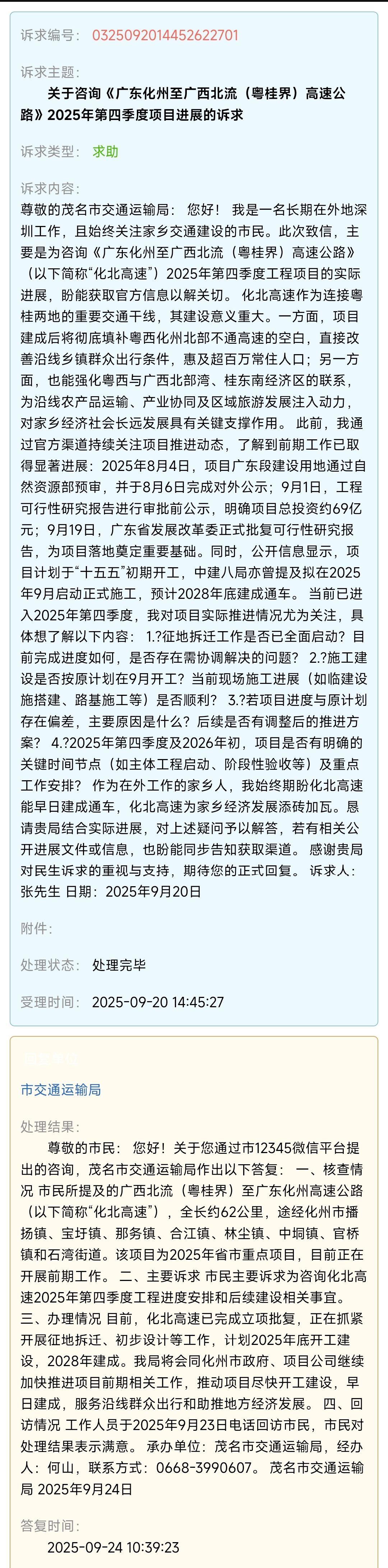 茂名市交通局电话回访说,2025年11月底优先开工容易征地的施工地