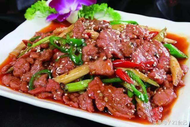 4)翻炒至牛肉片变色,放入蒜苔和尖椒