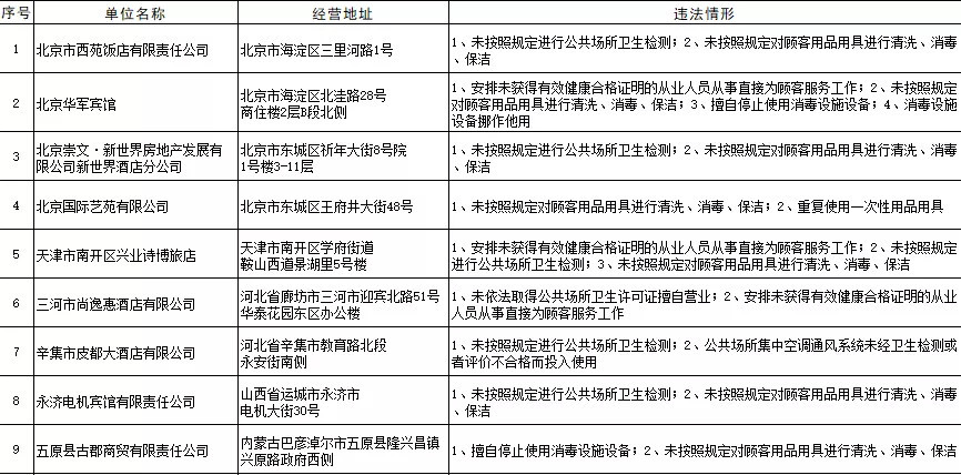 截至2019年3月31日,各地卫生健康部门共报告监督检查住宿场所157011家,责令25868家单位整改,依法对3474家单位立案查处。 记者注意到,被通报名单中不乏知名连锁酒店,如北京新世界酒店、浙江宁海格林豪泰宾馆因存在多项违法情形被通报,包括未按照规定对顾客用品用具进行清洗、消毒、保洁等。北京朝阳区芳园南街汉庭酒店因在2018年3月至2019年3月间多次违法受到查处被通报。