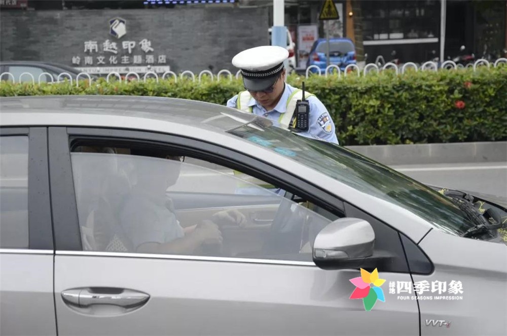 茂名交警正在对路边违停车辆进行抄牌处罚。