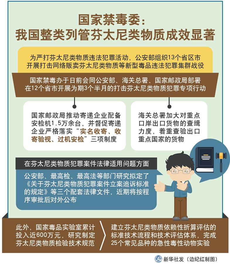 图表:国家禁毒委:我国整类列管芬太尼类物质成效显著 新华社发 边纪红 制图 为严打芬太尼类物质违法犯罪活动,公安部组织13个省区市开展打击网络贩卖芬太尼类物质等新型毒品违法犯罪集群战役。国家禁毒办于日前会同公安部、海关总署、国家邮政局部署在12个省市开展为期3个半月的打击芬太尼类物质犯罪专项行动。国家邮政局推动寄递企业配备安检机1.5万余台,并督促寄递企业严格落实“实名收寄、收寄验视、过机安检”三项制度;海关总署加大对重点口岸出口货物的查缉力度,着重查验出口重点国家的货物。 在芬太尼类物质犯罪案件法律适用问题方面,公安部、最高检、最高法等部门研究拟定了《关于芬太尼类物质犯罪案件立案追诉标准的规定》等三个配套法律文件,近期将按程序审批后对外公布。 此外,国家毒品实验室累计投入近600万元,研究制定芬太尼类物质检验技术规范,建立芬太尼类物质依赖性折算评估的标准技术流程和技术评估体系,完成25个常见品种的急性毒性动物实验。北京、浙江、广东、四川、陕西5个区域分中心毒品实验室共确定3.2万平方米的建设用地、260个人员编制、6.16亿初期建设及设备采购经费,力争年底前投入使用,3年内建成世界一流的毒品实验室体系。 国家禁毒办还部署在全国范围深入摸排生物医药基地和化工园区,核查涉及芬太尼类物质的重点企业和重点人员。公安部部署清理整顿互联网上涉及芬太尼类物质的信息,切断网上联络交易渠道;国家药监局部署开展芬太尼类药品生产经营专项检查,进一步加强对合法芬太尼药品的管控。 刘跃进表示,近年来,美国滥用芬太尼类物质问题愈演愈烈,引起国际社会广泛关注。为提早预防芬太尼类物质在中国的发展蔓延,中国政府不断强化管控措施,先后多次增加列管品种。中美两国缉毒执法部门多年保持良好合作关系,但合作侦办的芬太尼类物质案件十分有限。2012年以来,中方向美缉毒执法部门通报383条涉芬邮包信息,而美方向中方通报的芬太尼类物质走私案件线索仅6条。 “厉行禁毒是中国政府的一贯立场和坚决主张。中国政府愿与包括美国在内的世界各国深化合作,推动建立平等互信、互利共赢的合作关系,务实开展情报交流、线索分享和联合侦查,着力推进芬太尼类物质国际共治,共同分享毒品治理经验,携手解决禁毒难题。”刘跃进说。 来源:新华社