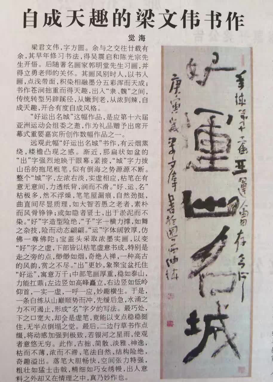 他(梁文伟)的书品出入“隶、魏”之间,传统转型另辟溪径,从嫩到老,从浓到辣,自成天趣,不愧成家。外人褒贬出于无奈,可作参考。信口雌黄,偏见难免。要有自信,不可摇曳,不能荒废。