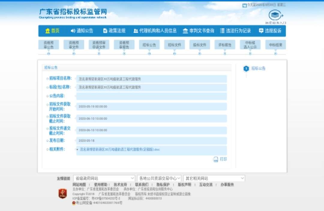 本招标项目茂名港博贺新港区30万吨级航道工程已由广东省发改委以粤发改交通函〔2019〕2866号文批准建设,项目业主为茂名博贺新港区建设指挥部办公室,建设资金来自财政资金。项目已具备招标条件,现对该项目的施工监理进行公开招标。项目概况与招标范围