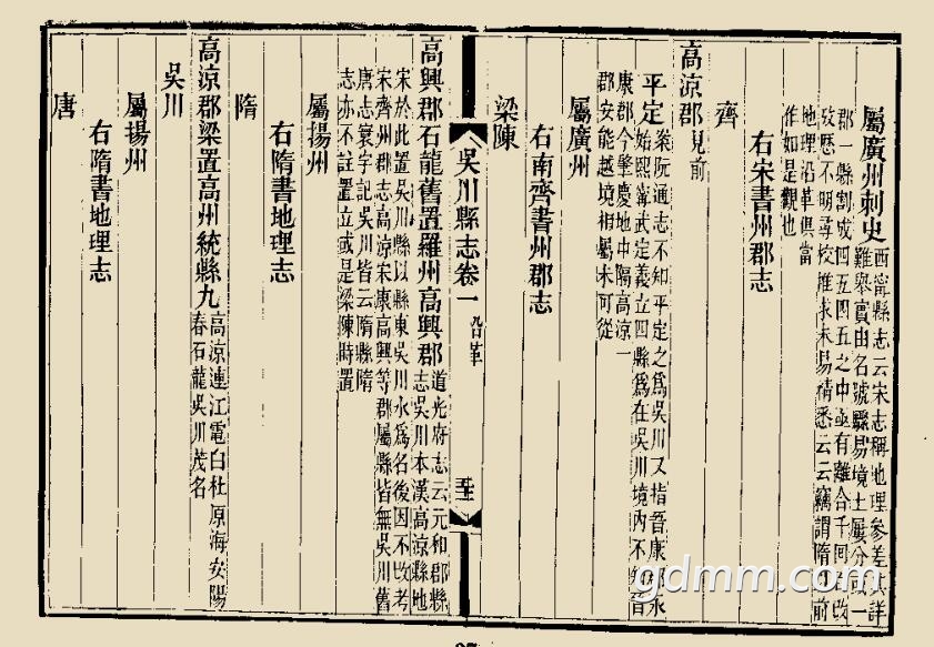 《吴川县志》有6卷,记载吴川县地图、历史沿革、星野、疆域、山川、防提、津梁、
