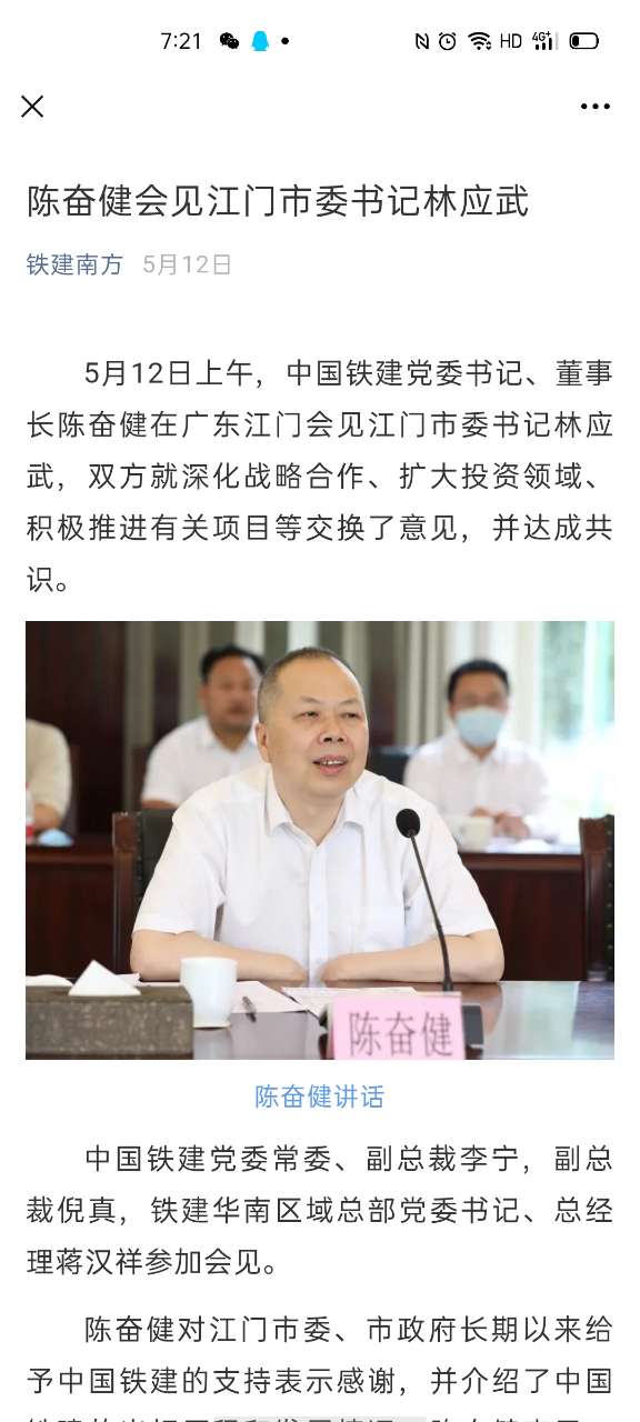 7月15日上午,中国铁建党委常委、副总裁李宁在茂名会见茂名市委书记、市人大常委会主任许志晖、市委副书记、市长袁古洁,双方就进一步加强战略合作、加快合作项目落地进行了深入交流,并达成广泛共识。中国铁建华南区域总部党委书记、总经理蒋汉祥参加会见。
