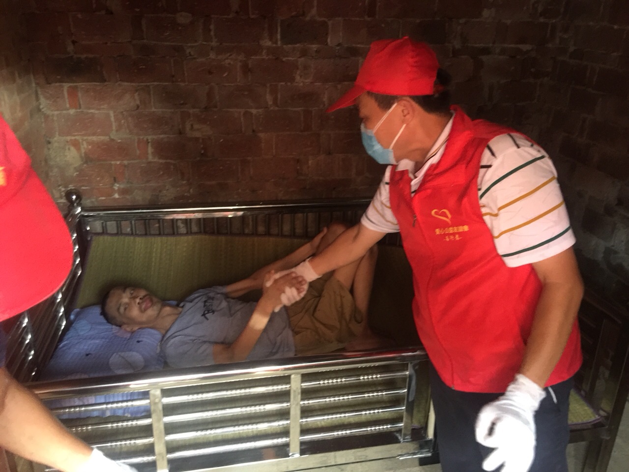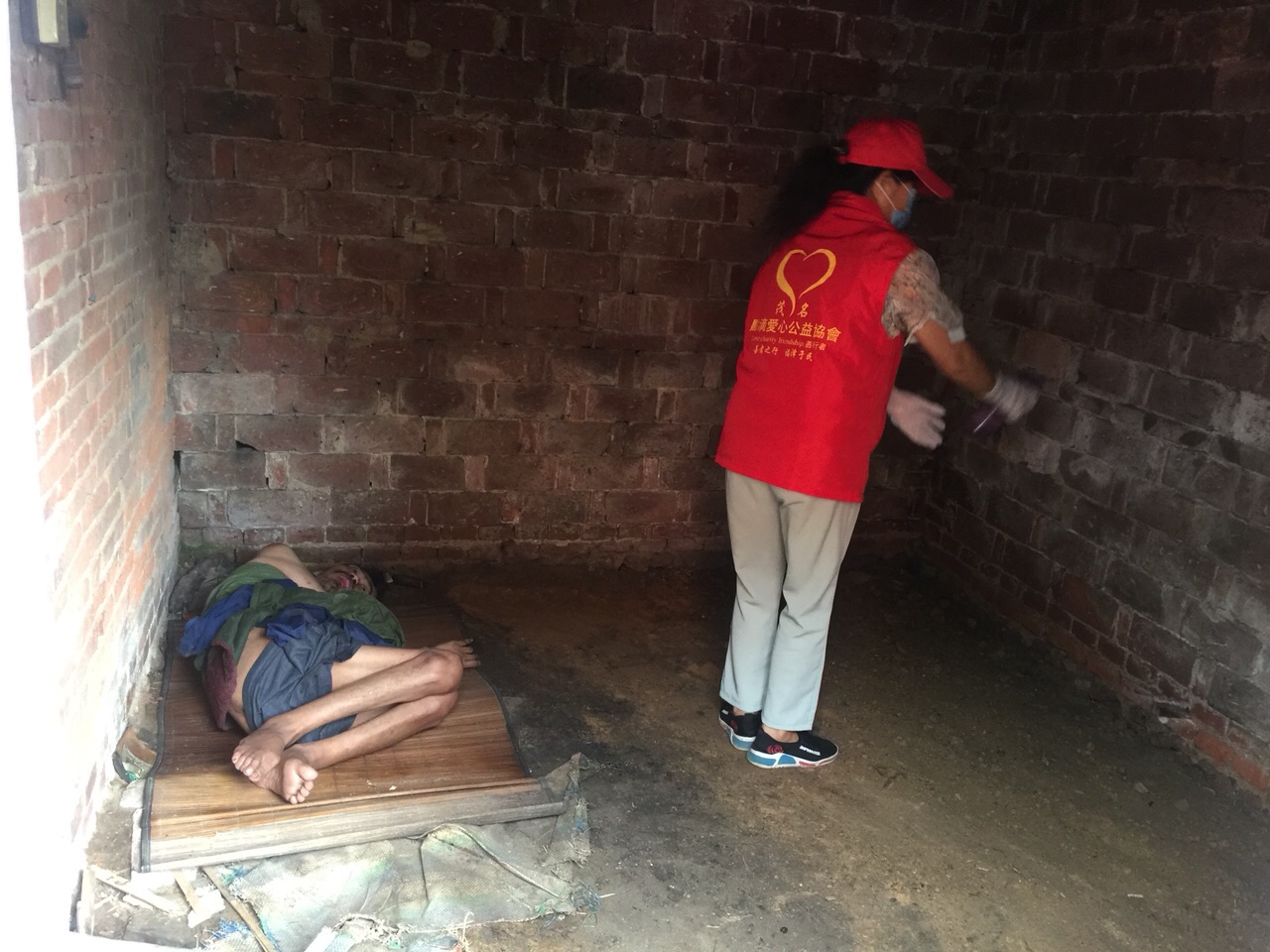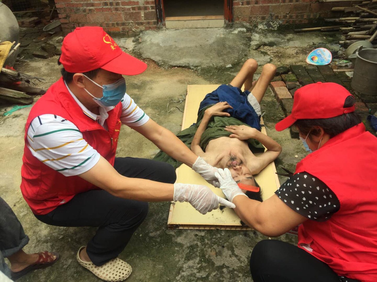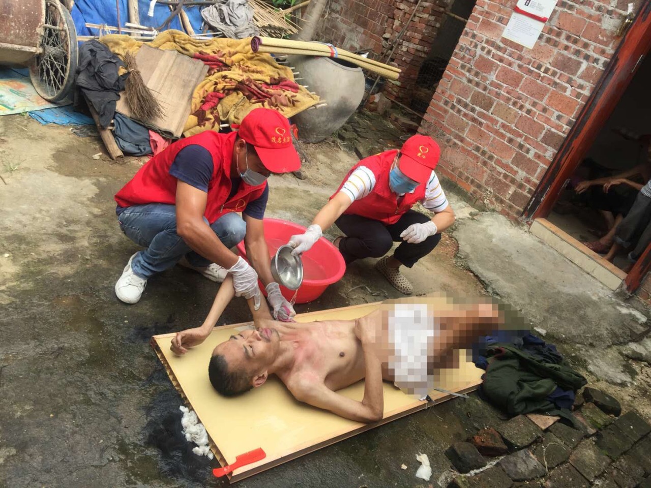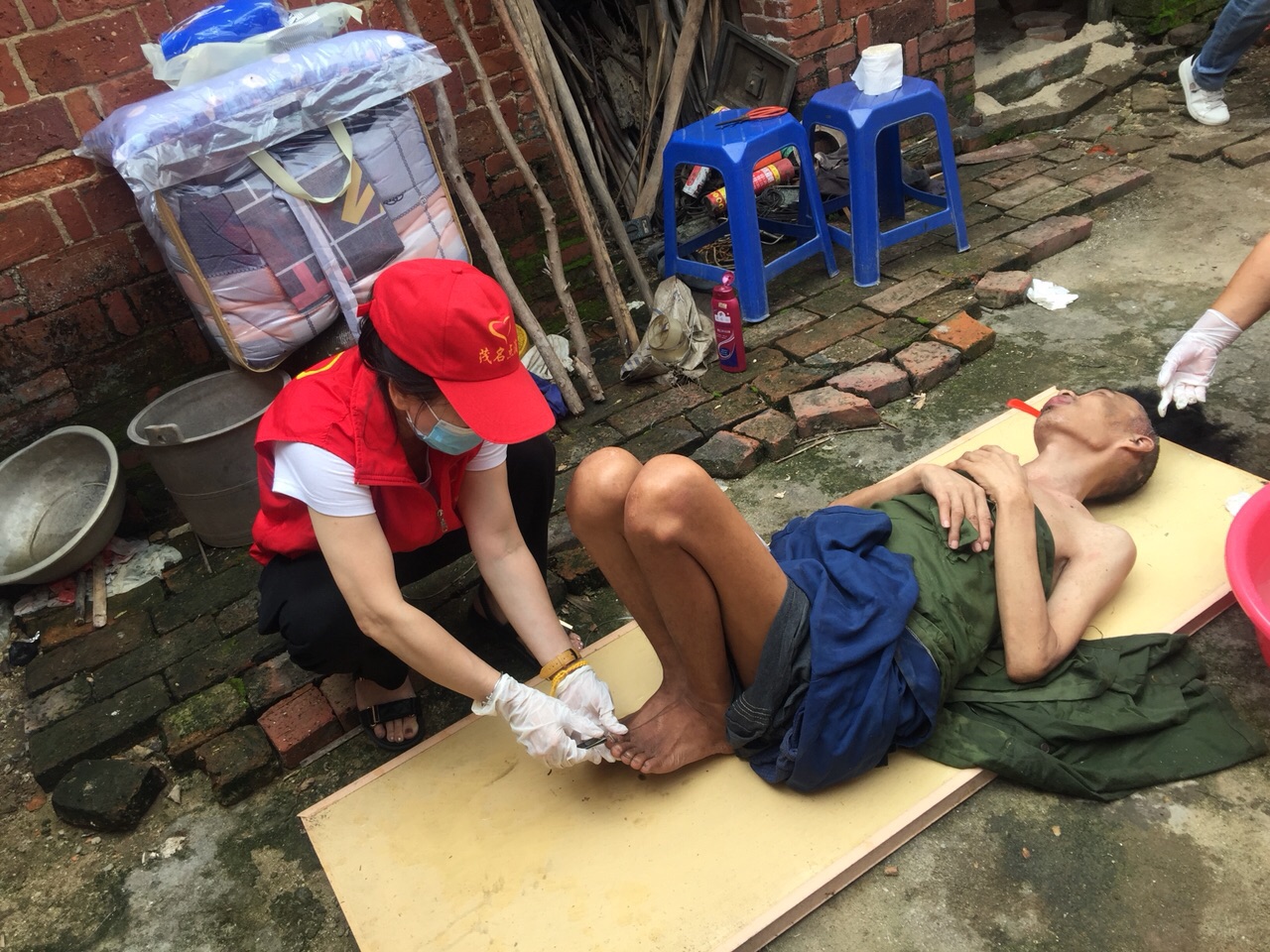 活动现场:点滴志愿者为小陈整理个人卫生…现场环境非常恶劣