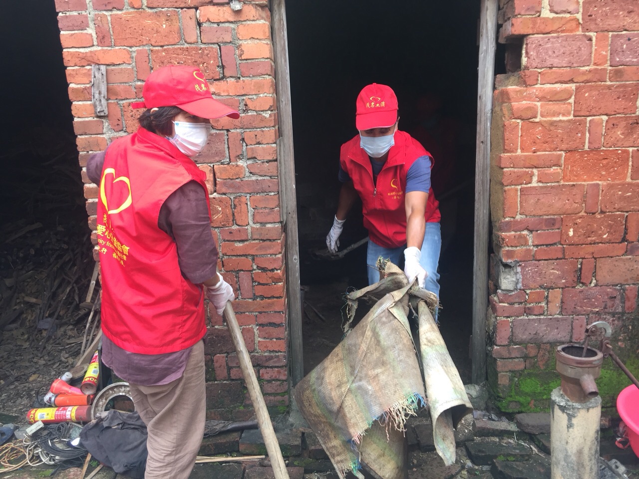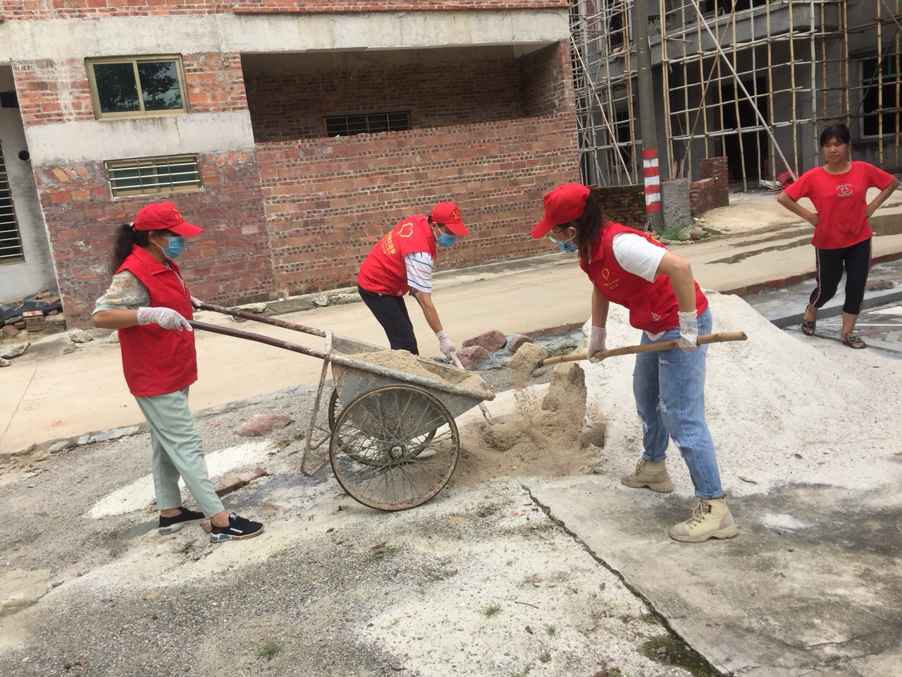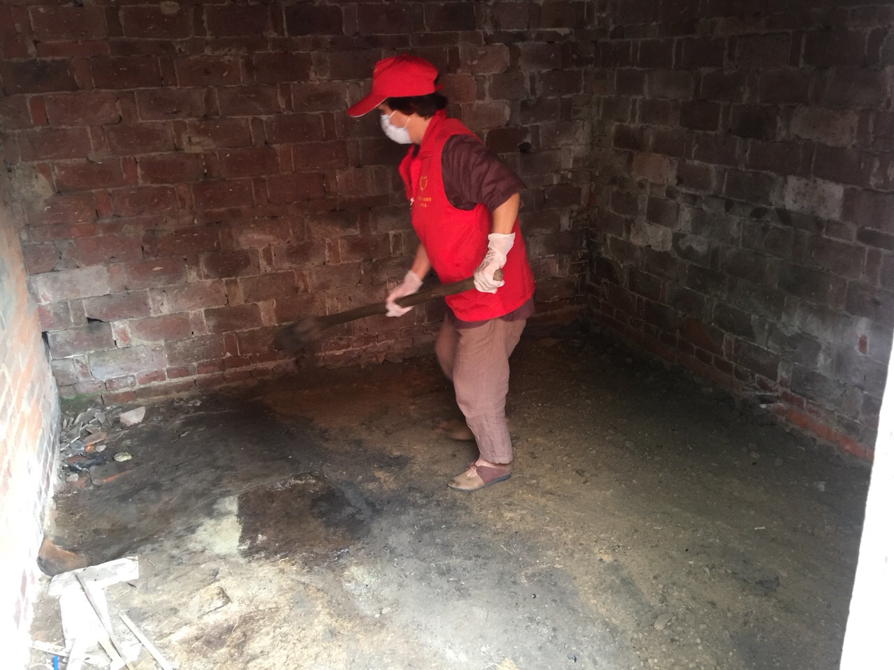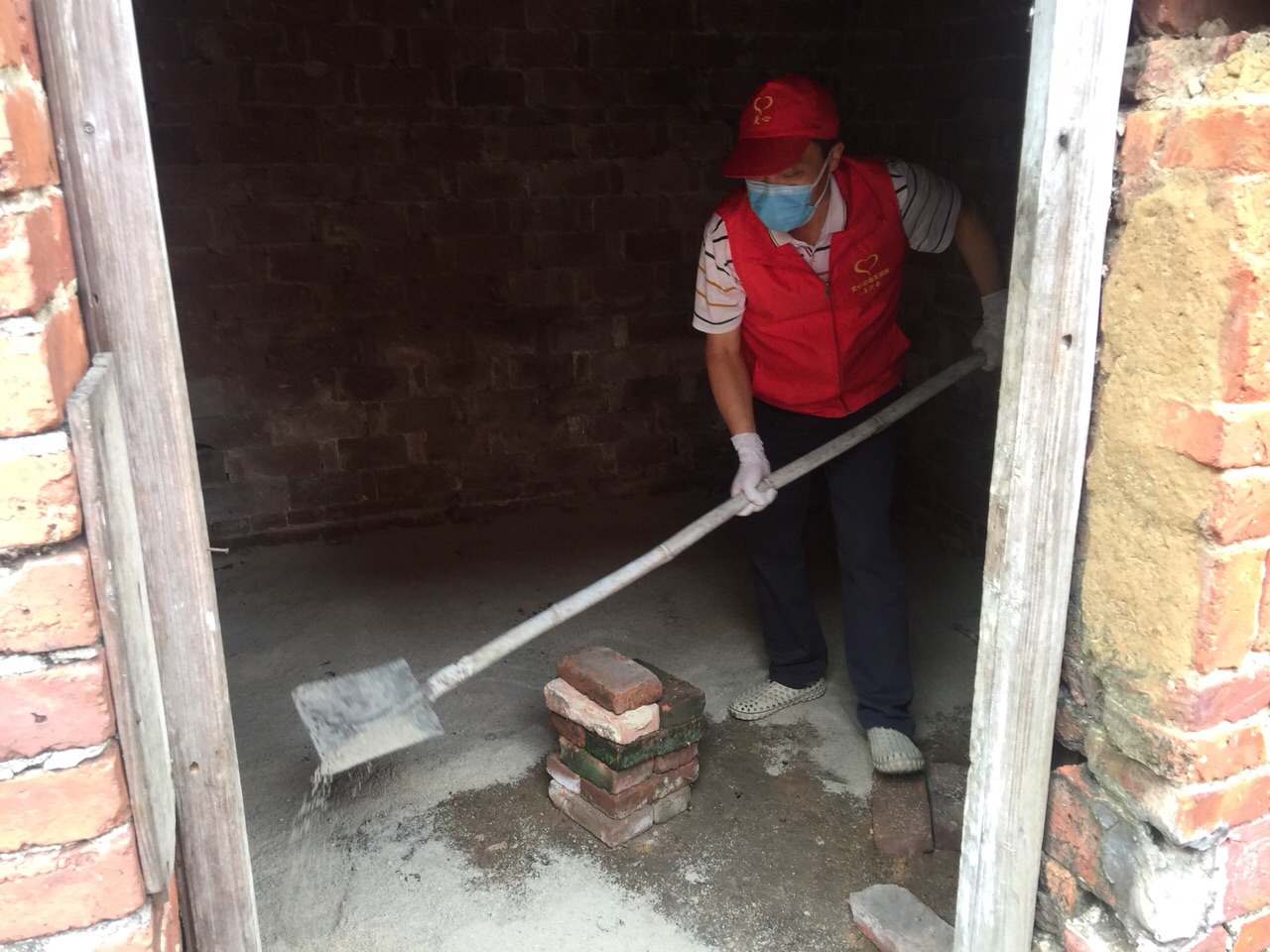 活动现场:点滴志愿者打扫房间拉沙铺垫地面