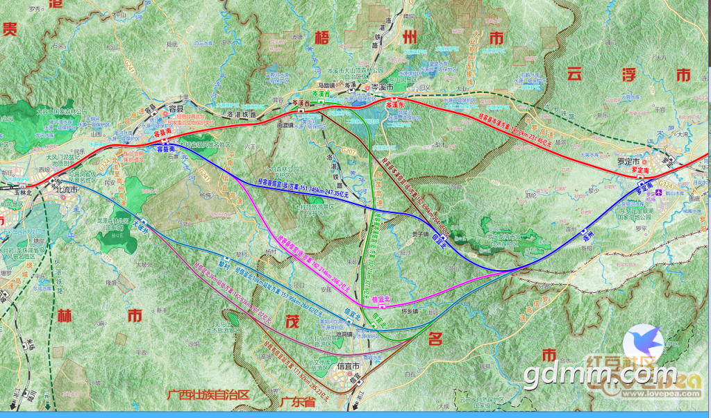 过境信宜多了12公里(图一),但是,云浮可以沟通信宜、高州、茂名、高州、化州及其他粤西城市,还可以直通海南。我看好处还是比过境岑溪多一些。