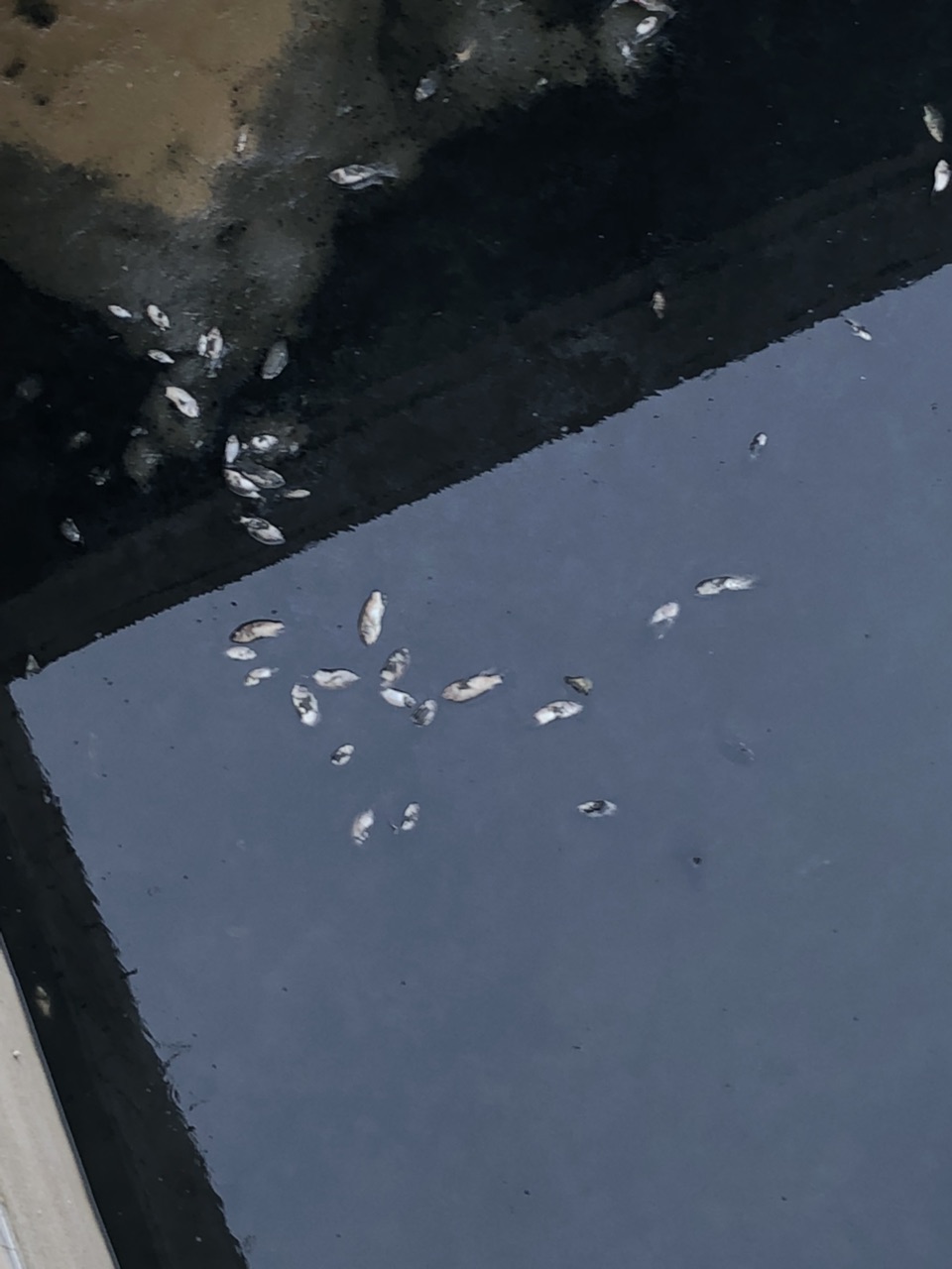 散步的市民说黄水是上游(大塘桥方向支流)流下来的,而且这并非只是单纯黄泥水,而是混杂了大量了上游洗砂场偷排的污染水,所以才会出现这么多死鱼