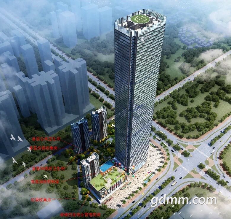 在顶楼将设置观光平台、观光电梯,届时市民可乘电梯至268米高空俯瞰茂名市区。此外,顶楼建造直升飞机停机坪,进一步助力茂名打造大都市形象。