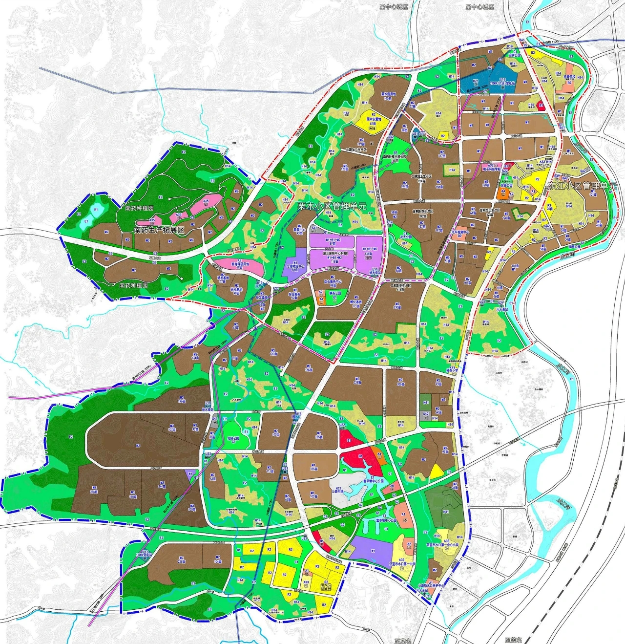 东江小 区管理单元范围:东至东江, 西至207国道, 南至药港大道, 北至砚儒大道, 规划面积合计为133公顷。