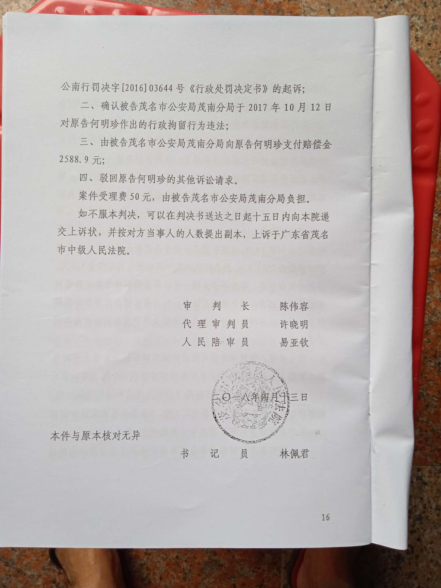 关于违法拘留的控告状 控告人(一审二审原告):何明珍,女,1965年出生,汉族,住广东省茂名市茂南区公馆镇横山村四组*号电话18211373841