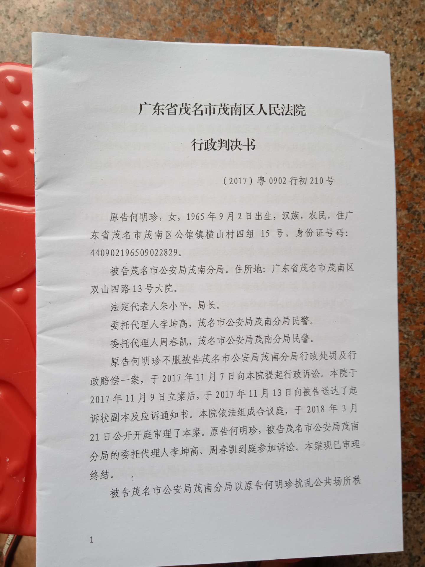 法定代表人朱小平,原局长。现任局长叶富山。委托代理人李坤高,茂名市公安茂南分局民警。委托代理人陈文胜,茂名市公安局茂南分局民警。被控告人茂名市公安局茂南分局(以下简称被控告人)用茂公南行罚决字【2016】03644号行政处罚决定书拘留控告人不服向茂名市茂南区人民法院提起行政起诉,茂名市茂南区人民法院依法作出(2017)粤0902行初210号行政判决书。确认被控告人于2017年10月12日对控告人何明珍作出的行政拘留行为违法;驳回控告人的其他诉讼请求。控告人不服向茂名市中级人民法院上诉,1、请求依法对一审未确认光盘视频里几十人的真实性名身份;2、请求依法对一审末确认的茂名市人民医院疾病诊断证明书证10148804号血压高171度底110度是不符合拘留的。 茂名市中级人民法院作出(2018)粤09行终88号行政判决书维持原判。按此,根据刑法规定,今依法提起控告。