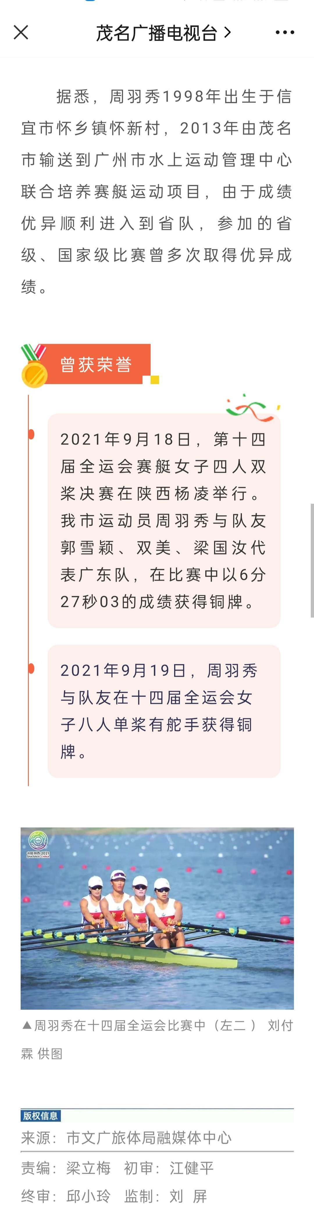 据悉,周羽秀1998年出生于信宜市怀乡镇怀新村,2013年由茂名市输送到广州市水上运动管理中心联合培养赛艇运动项目,由于成绩优异顺利进入到省队,参加的省级、国家级比赛曾多次取得优异成绩。 2021年9月18日,第十四届全运会赛艇女子四人双桨决赛在陕西杨凌举行。我市运动员周羽秀与队友郭雪颖、双美、梁国汝代表广东队,在比赛中以6分27秒03的成绩获得铜牌。 2021年9月19日,周羽秀与队友在十四届全运会女子八人单桨有舵手获得铜牌。 ▲周羽秀在十四届全运会比赛中(左二 ) 刘付霖 供图