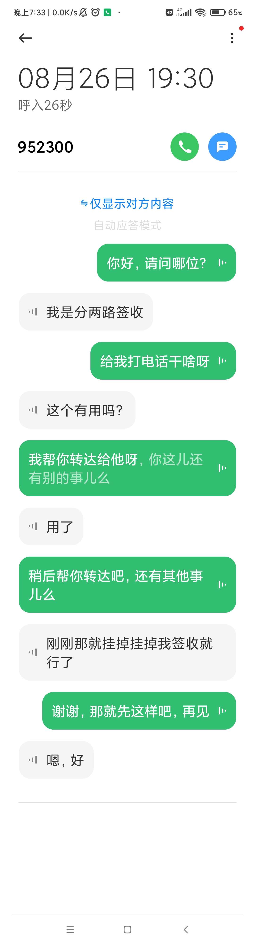 一开始快递员打来的电话,它接了后还挺机械回答的,经过几轮下来,它居然自己来了一句,“OK,辛苦了!”