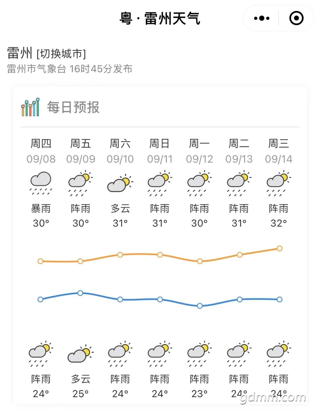 9日,韶关、清远和雷州半岛多云间阴天,有(雷)阵雨局部大雨或暴雨,其余市县多云,有分散(雷)阵雨。最高气温:粤东、粤北大部、珠三角东部市县31℃~34℃,其余市28℃~31℃。