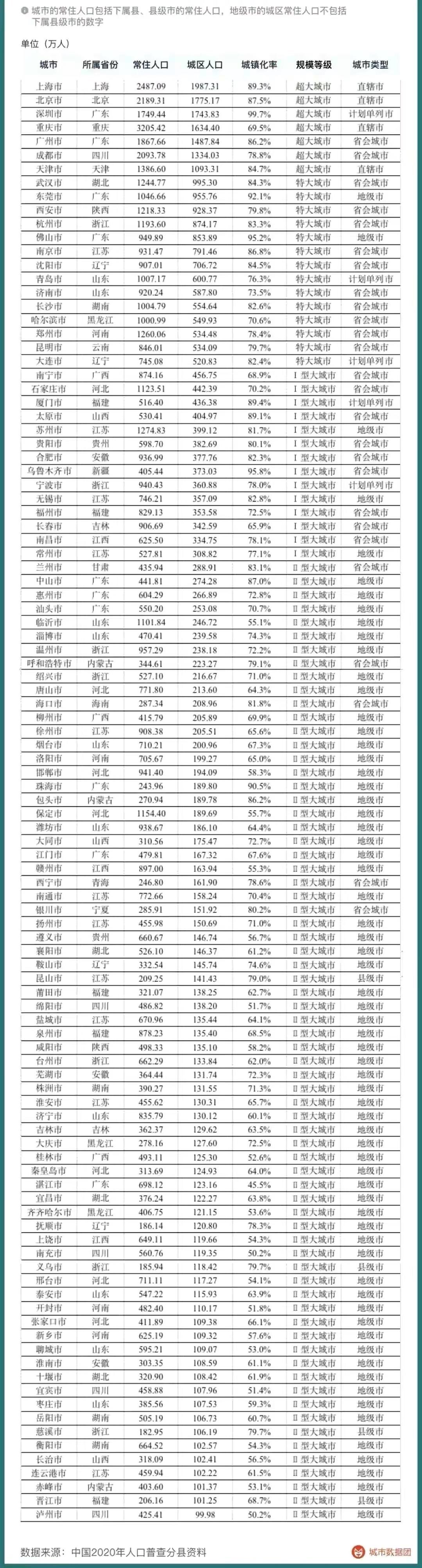 国务院第七次全国人口普查领导小组办公室编制的《2020中国人口普查分县资料》(下称《分县资料》),公布了全国县级以上单位的人口数据,683个城市(包括直辖市、计划单列市、省会城市、普通地级市及县级市)的城区人口数据也对外公开。其中,根据城区常住人口数量,将城市分为五类七档:城区常住人口1000万以上城市为超大城市,500万~1000万为特大城市,而300万~500万的I型大城市和100万~300万的II型大城市并称为大城市。