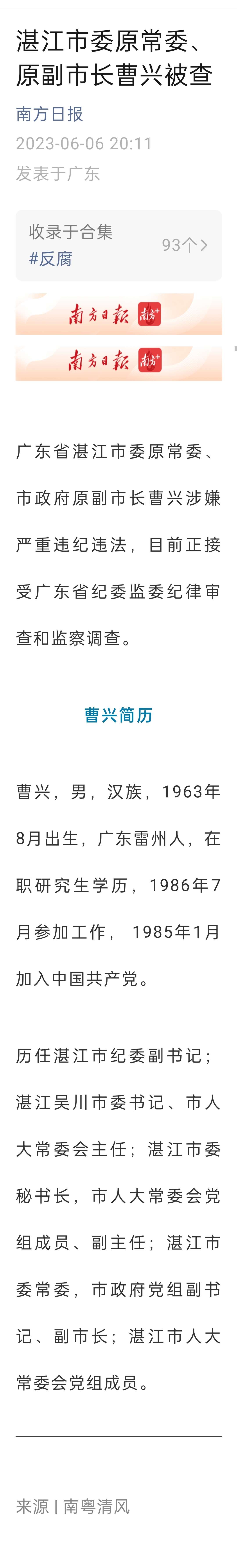湛江市委原常委、原副市长曹兴被查