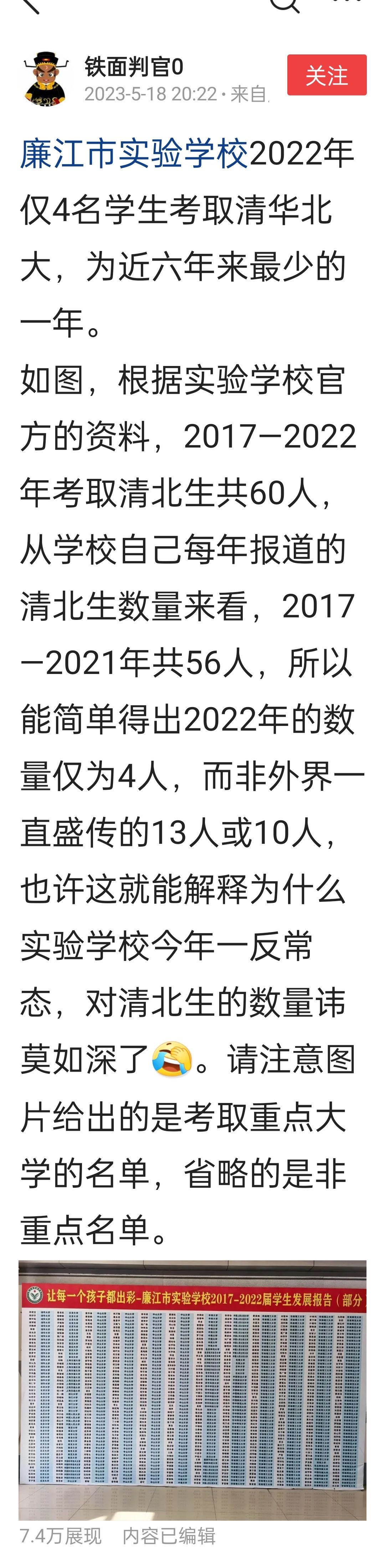 茂南大新区 发表于 2023-6-26 12:24 你三自媒体吹牛已经成为笑话,2022年水廉某学校只有4人达到清北线,你三自媒体却吹成16人。至今你三都未 ...