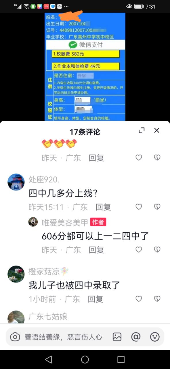 高州的。1.2.4中今天可以查在录取到哪个学校了。直接在公众号缴费。再过几天去校门口领录取通知书,8.30开学。。