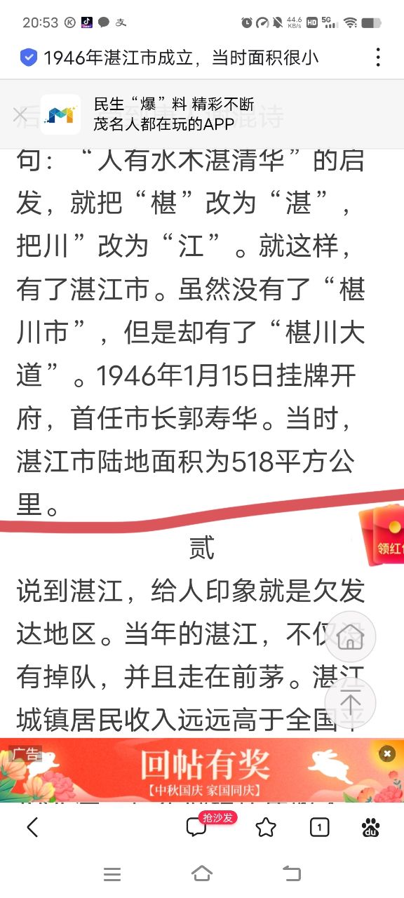 蓝了海 发表于 2023-10-15 15:18 湛江1946年建市,不懂就去查。45年邓龙光将军收复广州湾