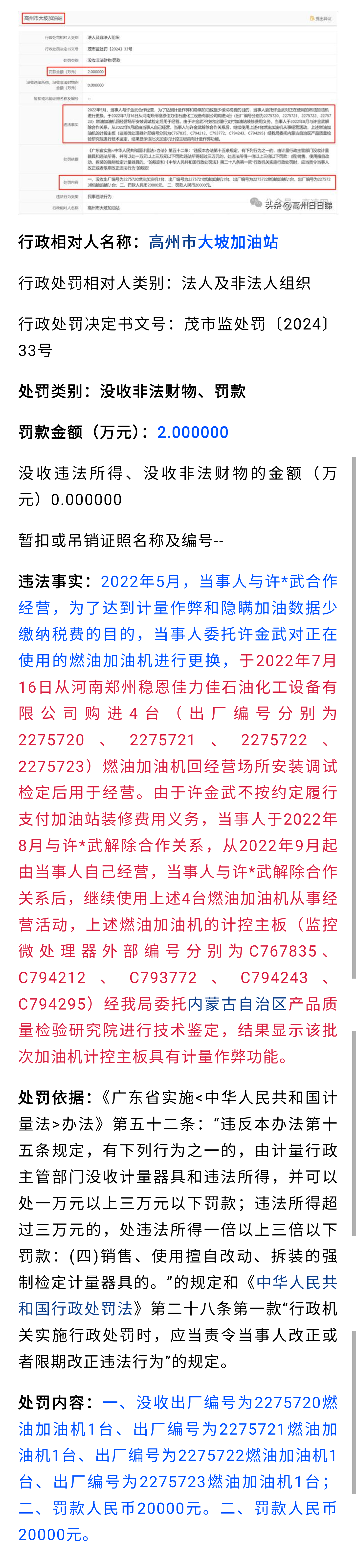[民生百态] 茂名市监局重罚化州某加油站860多万元,被省市监局列为公布案例!