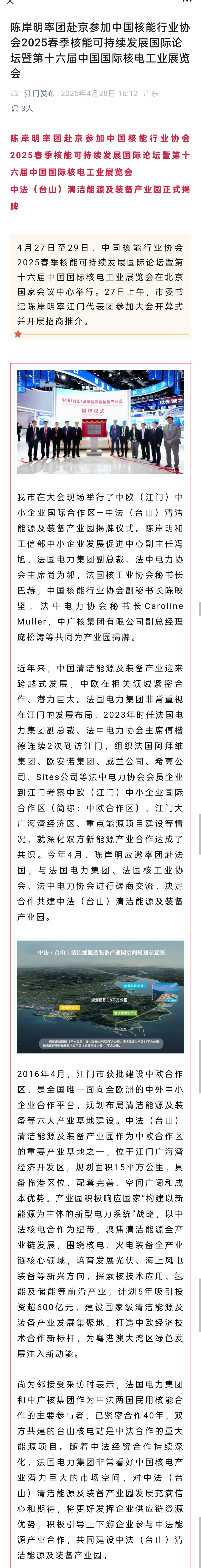 成哥 发表于 2025-12-18 00:20 这个项目可能还没台山的中法清洁能源产业园靠谱,毕竟中法两国887有共建台山核电一期的合作经历。