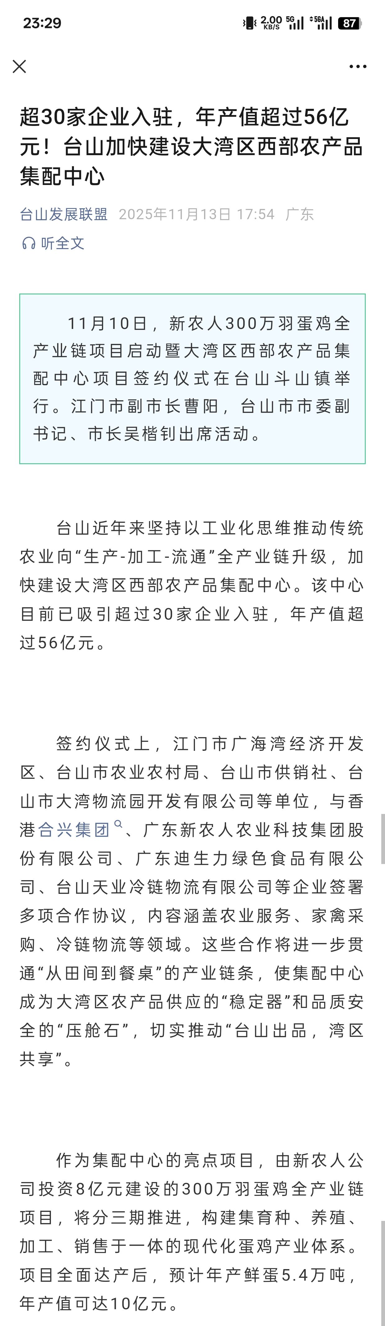 成哥 发表于 2025-11-30 23:43 台山在农业方面的企业投资,在全省县域应该都是独一档的,仅今年有报道的签约及备案的项目就将近30亿。 ...