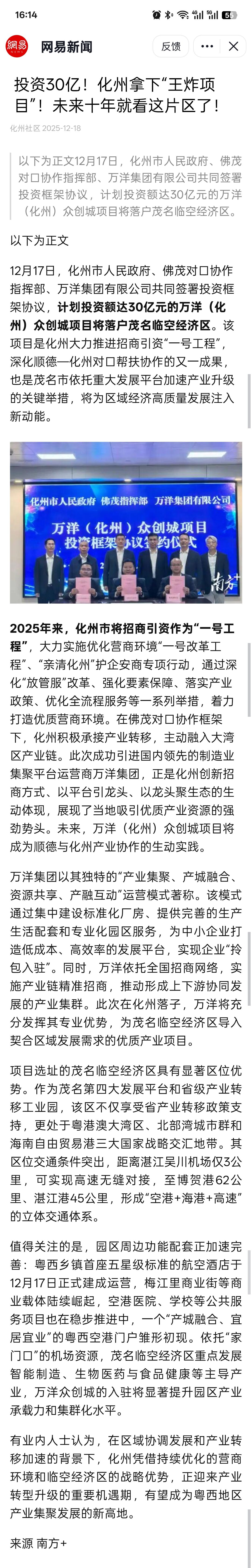 罗州郡 发表于 2025-12-18 15:57 12月17日,化州市人民政府、佛茂对口协作指挥部、万洋集团有限公司共同签署投资框架协议,计划投资额达30 ...