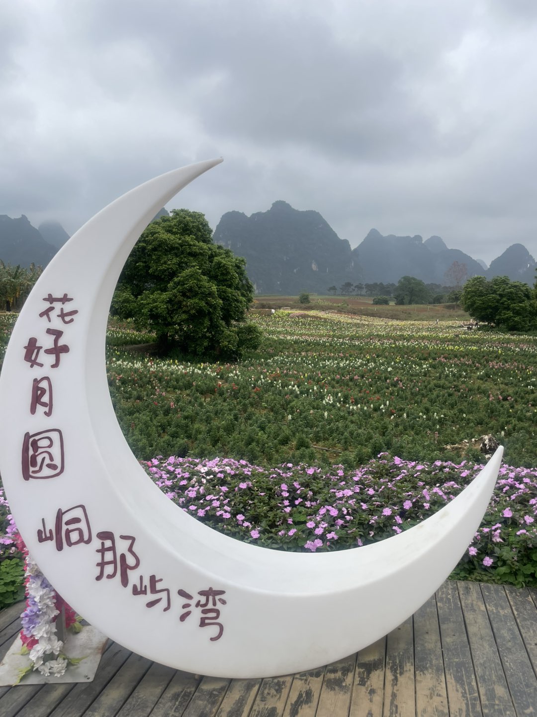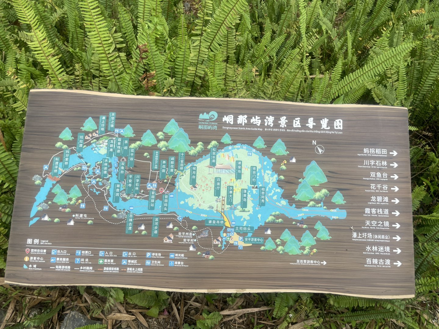 第一张图中的“湾屿那岜”牌匾及周边装饰,结合地貌特征,印证了这是明仕田园景区内的特色节点。