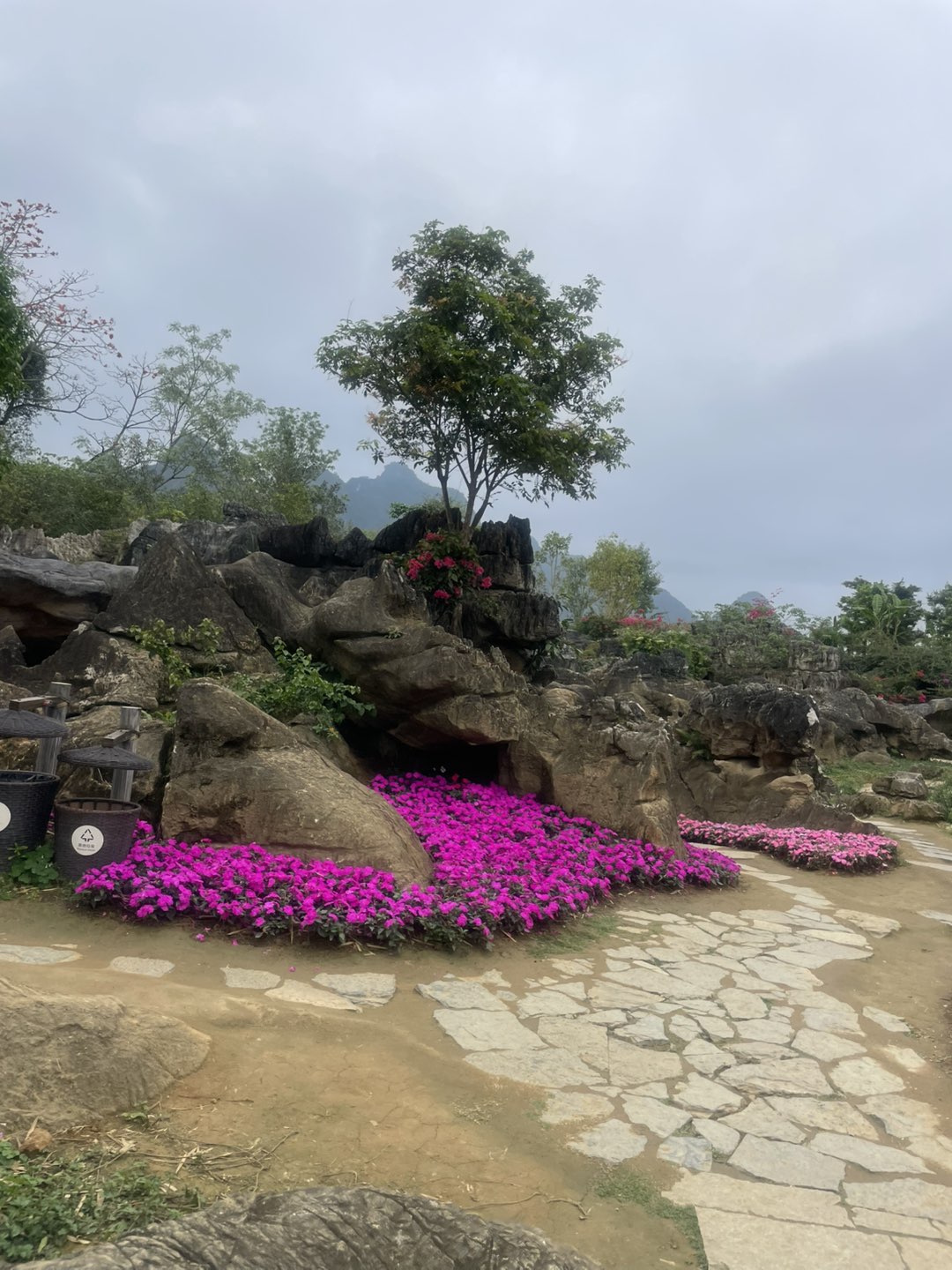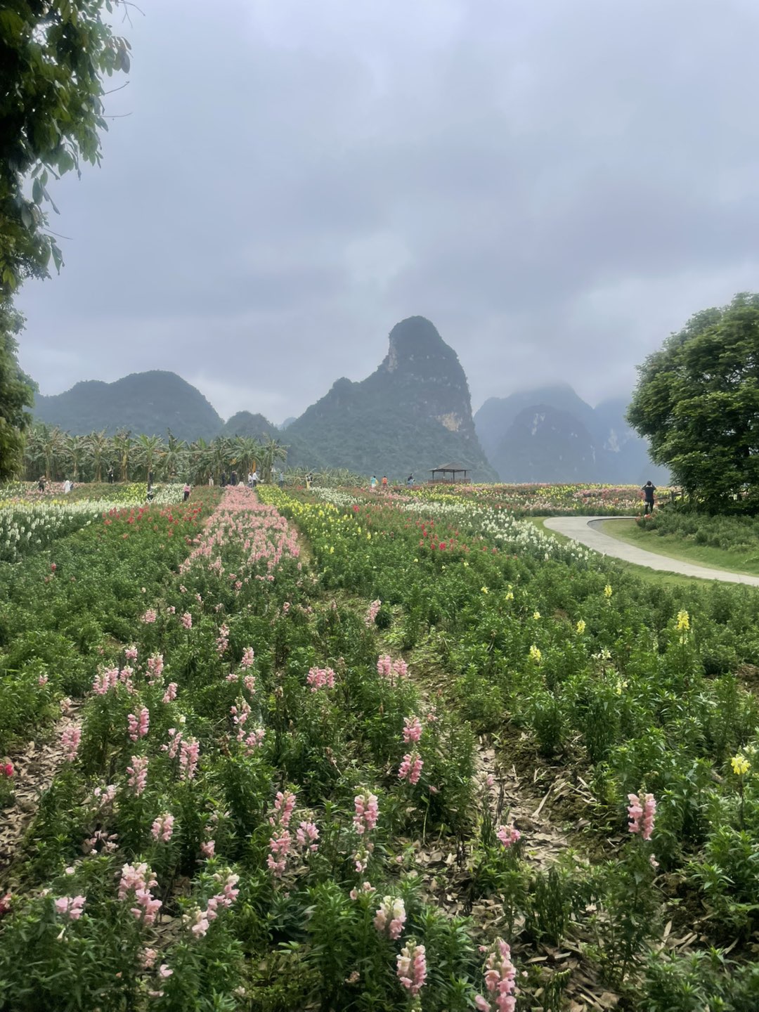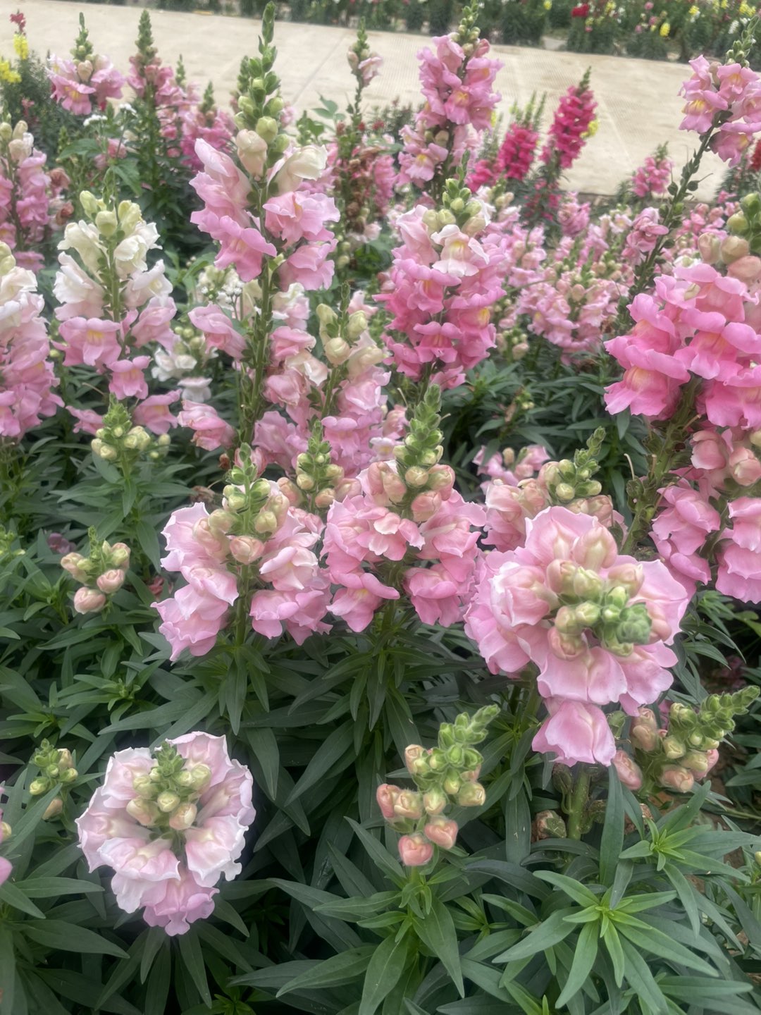 画面中盛开的三角梅、金鱼草等花卉色彩艳丽,结合植被状态推测拍摄时为春季或初夏。