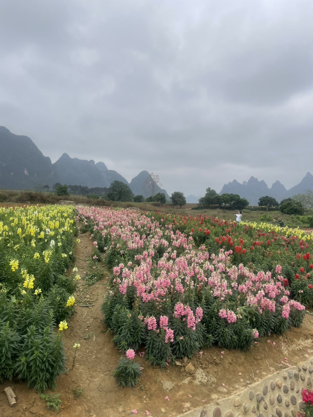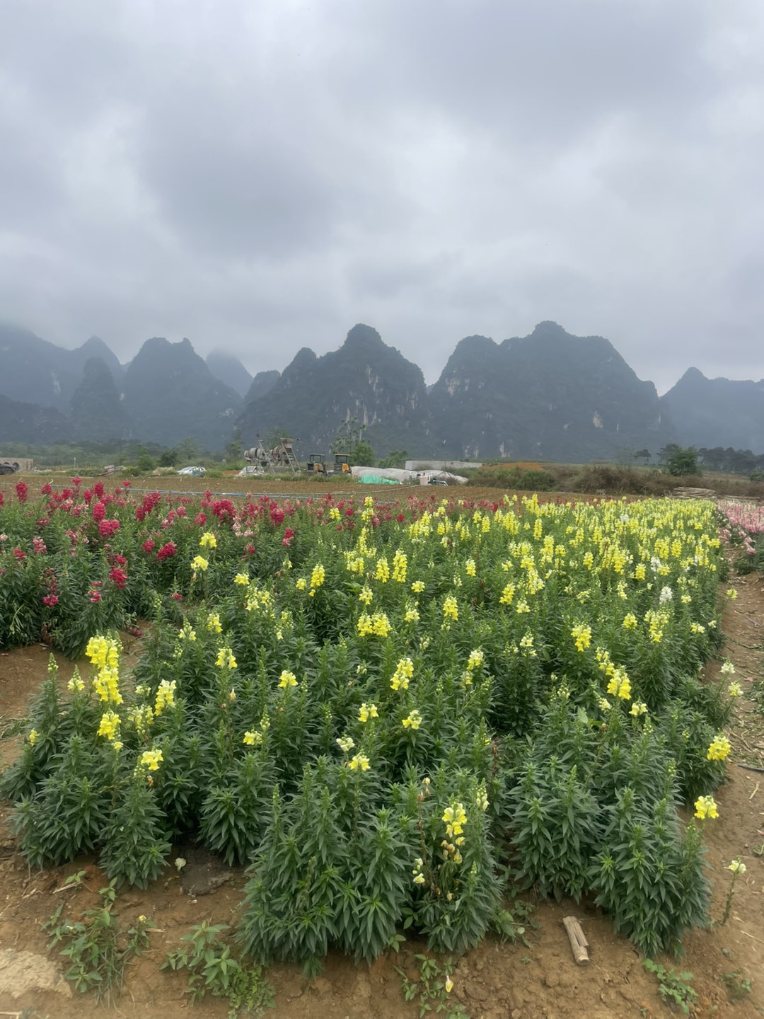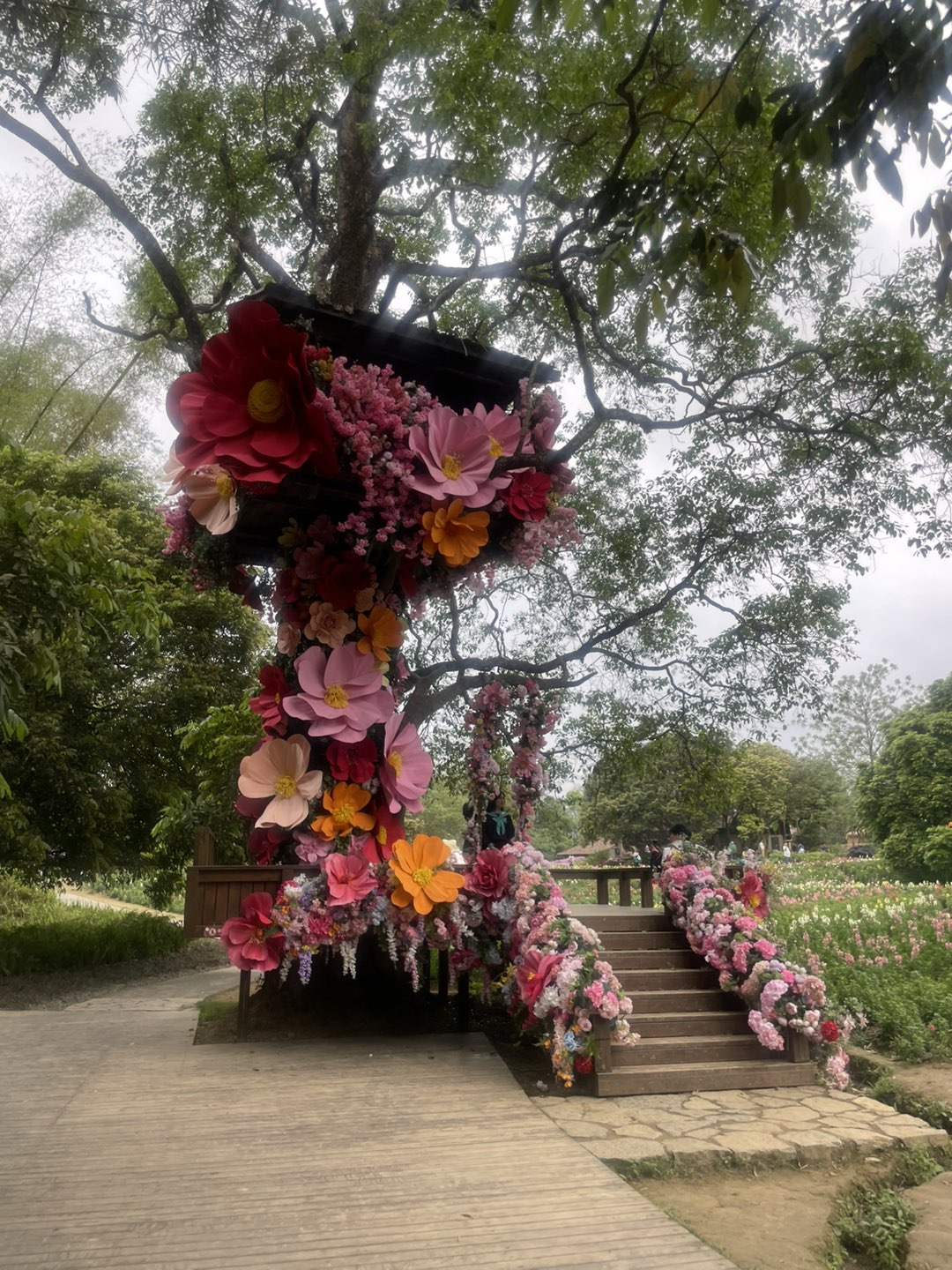 画面中盛开的三角梅、金鱼草等花卉色彩艳丽,结合植被状态推测拍摄时为春季或初夏。