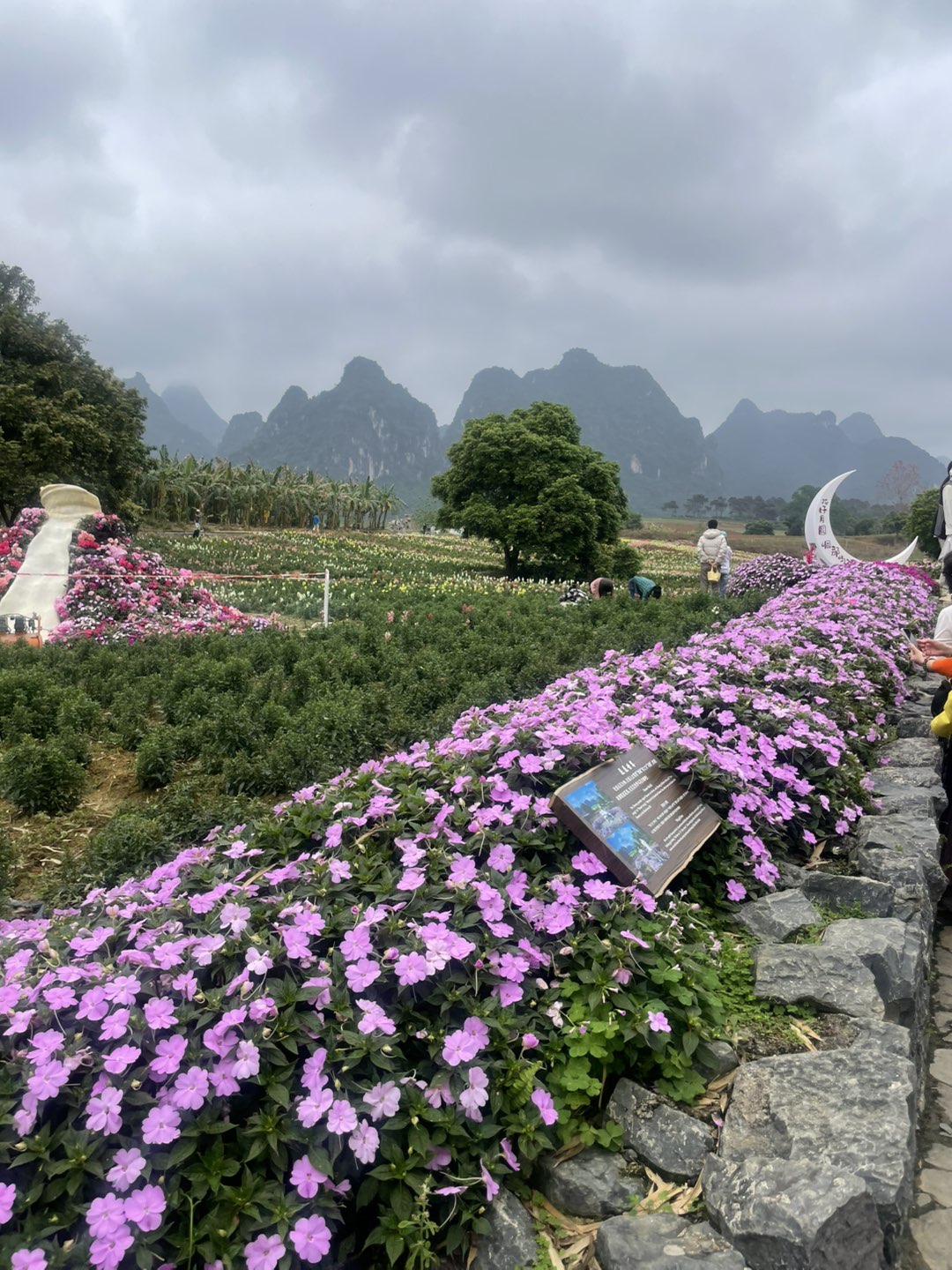 图片中连绵的山峰呈现独特的喀斯特岩溶地貌,孤峰拔地而起,形态圆润陡峭,与清澈的水域、成片的花海构成了明仕田园标志性的山水画卷。